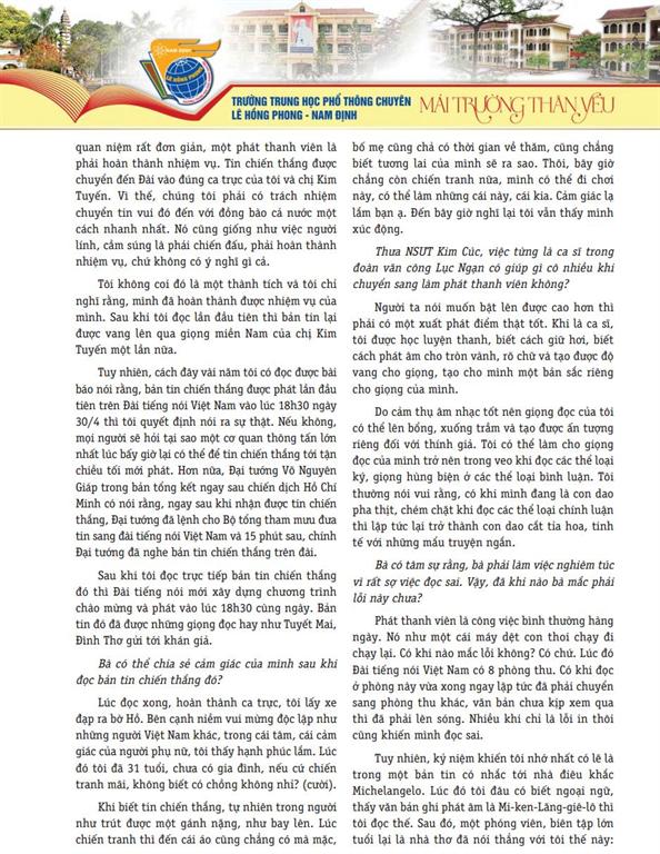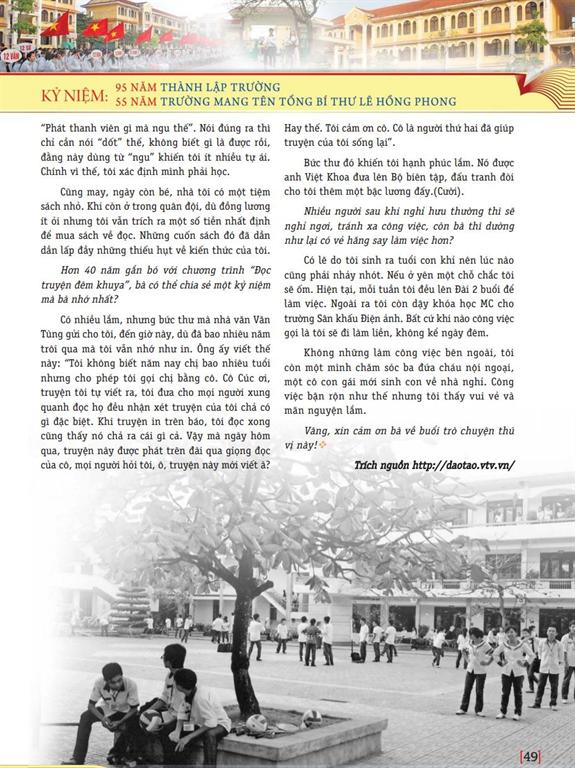 21/04/2015Bài viết trích trong kỷ yếu "Mái trường thân yêu" kỷ niệm 95 năm thành lập trường, 55 năm trường mang tên Tổng bí thư Lê Hồng Phong
