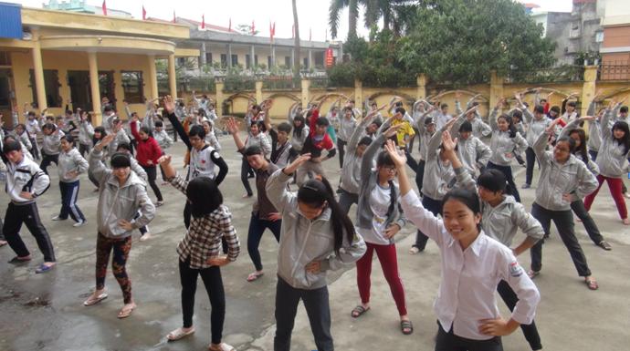 Học sinh kí túc xá tập bài thể dục buổi sáng