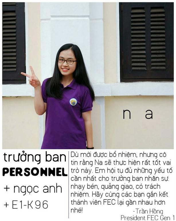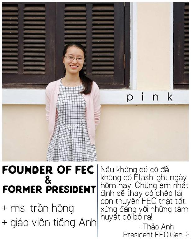 11/04/2017Sau hơn 1 năm với sự dẫn dắt và định hướng của nhà trường, các thầy cô trong nhóm Tiếng Anh và đặc biệt là hai cô giáo trẻ, nhiệt huyết Trần Thị Hồng và Đinh Thị Nga – những người trực tiếp thành lập và đóng vai trò “thủ lĩnh” của câu lạc bộ Tiếng Anh Flashlight, FEC đã trở thành một trong số những câu lạc bộ phát huy được sự sáng tạo, tự tin, năng lực của học sinh trong toàn trường với nhiều hoạt động bổ ích, phong phú và lôi cuốn. Nguyễn Ngọc Anh - Trưởng ban Nhân sự