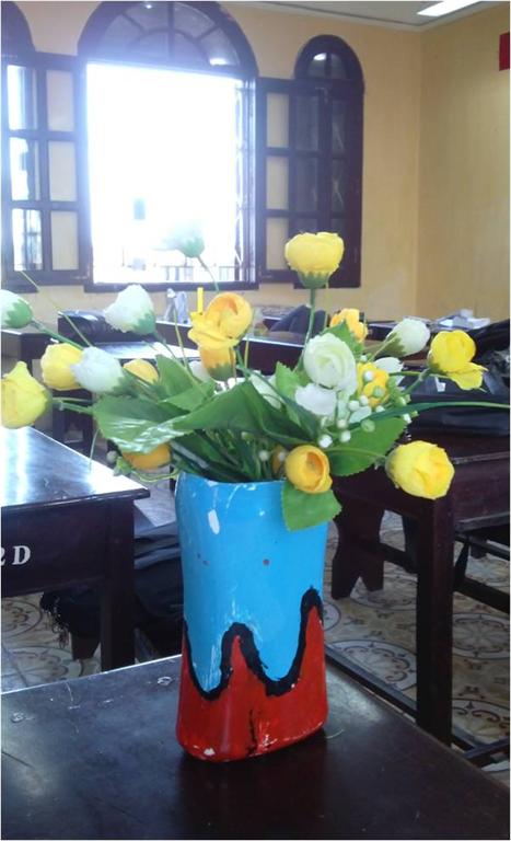 Bên cạnh những lọ hoa, hót rác, khung ảnh….các em học sinh còn tận dụng những chai nhựa thừa để tạo ra các chậu cây, bổ sung cho các hành lang lớp học và nôi trú, tạo ra không khí trong lành.