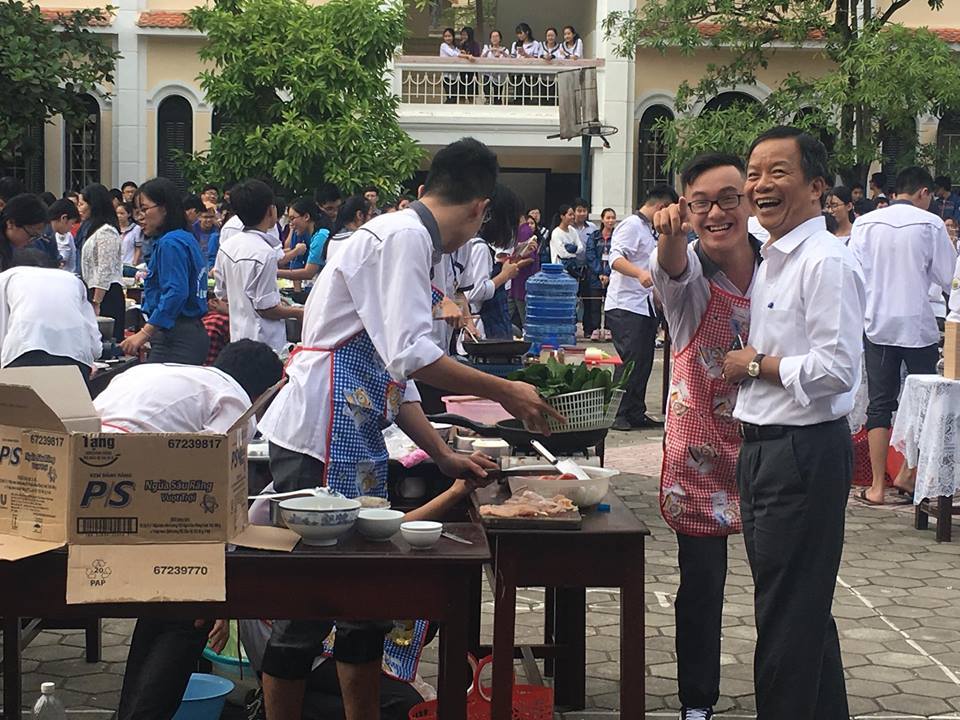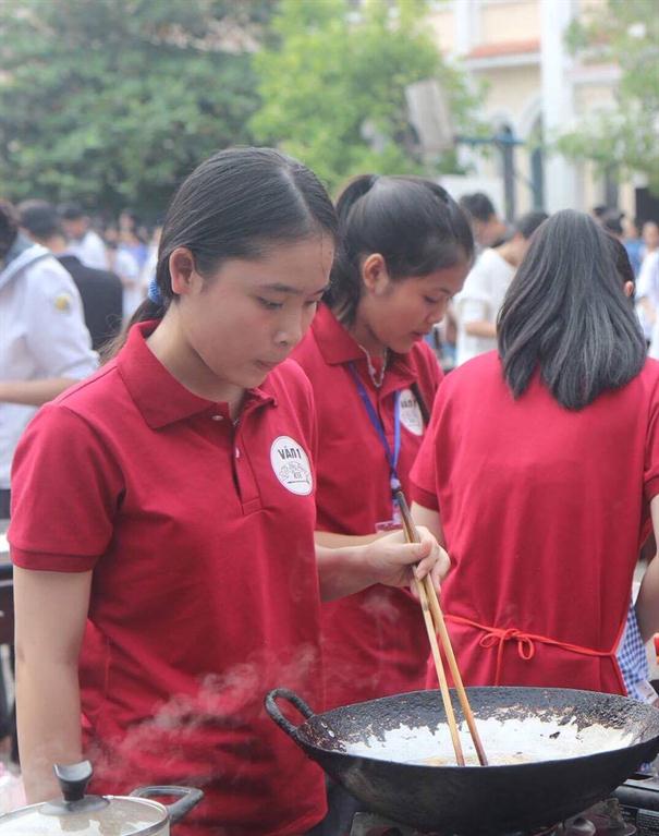 sân trường bỗng trở nên nhộn nhịp, rộn ràng trong thanh âm của tiếng dao thớt,