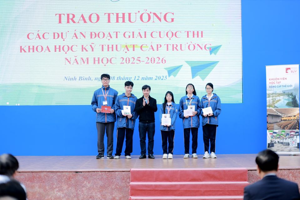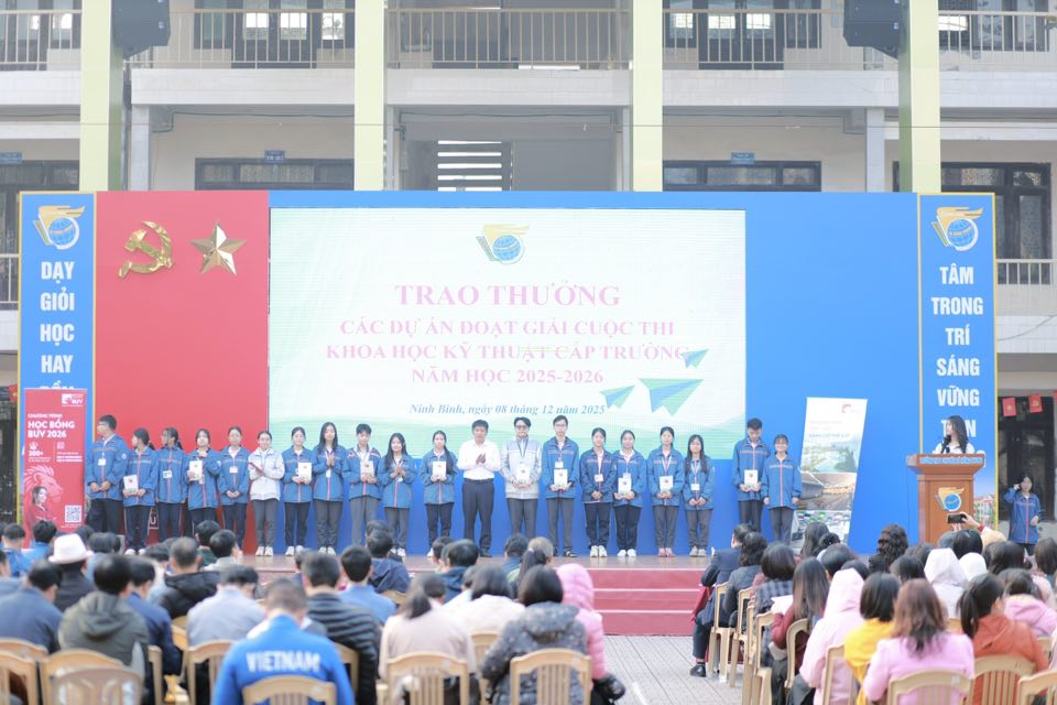 Tiếp đó, thầy Bùi Thái Học – Phó Hiệu trưởng và thầy Nguyễn Hữu Thiêm – Phó Hiệu trưởng đã trao phần thưởng cho các dự án đạt giải Cuộc thi Khoa học kỹ thuật cấp trường năm học 2025–2026. Những sản phẩm sáng tạo được vinh danh một lần nữa khẳng định tinh thần đột phá, ham học hỏi và năng lực nghiên cứu của học sinh Lê Hồng Phong.