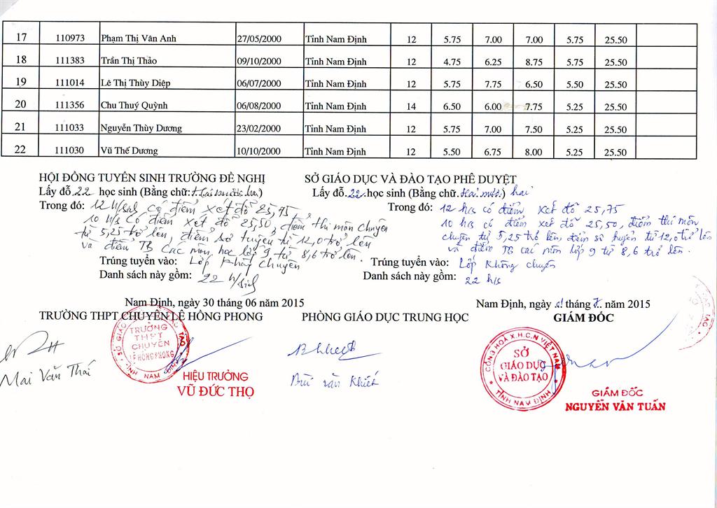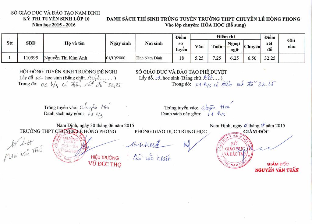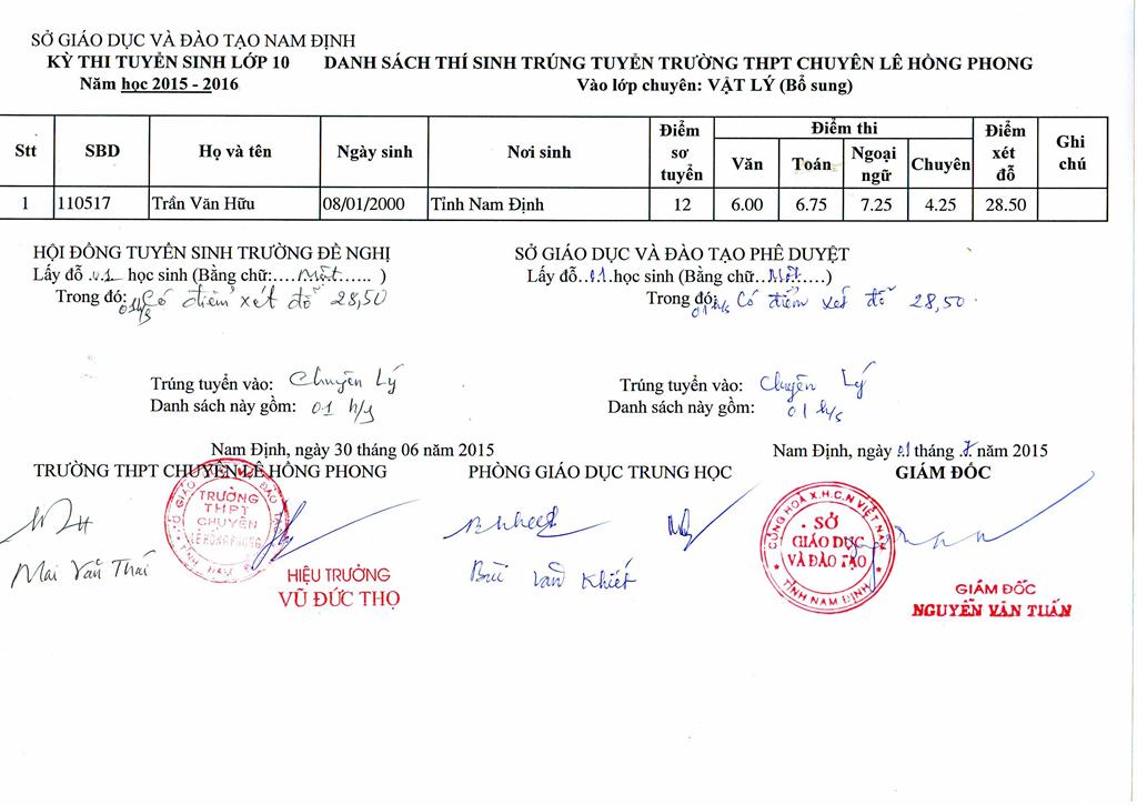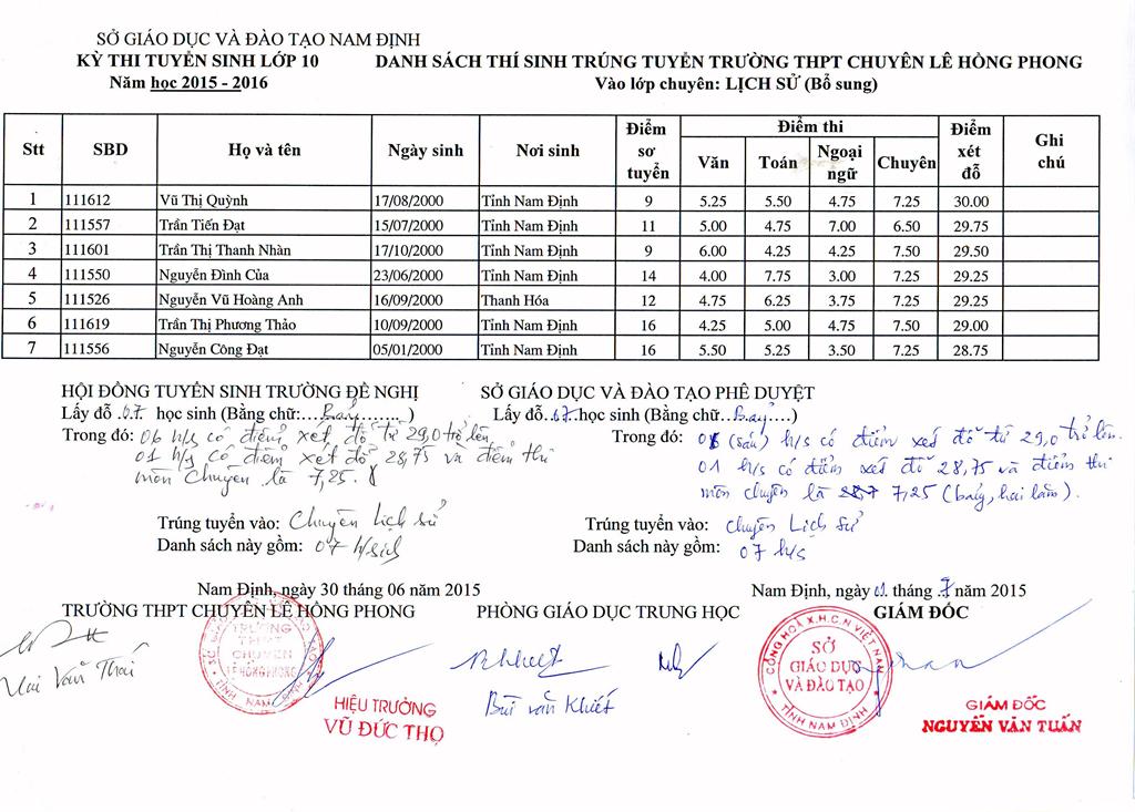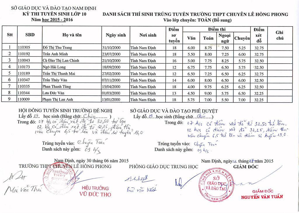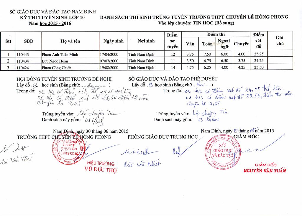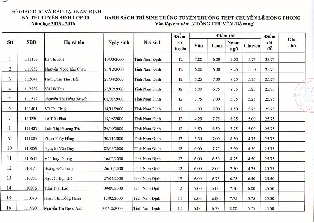 DANH SÁCH HỌC SINH TRÚNG TUYỂN BỔ SUNG VÀO TRƯỜNG NĂM HỌC 2015 - 2016