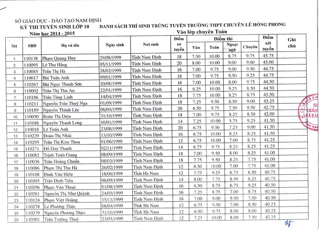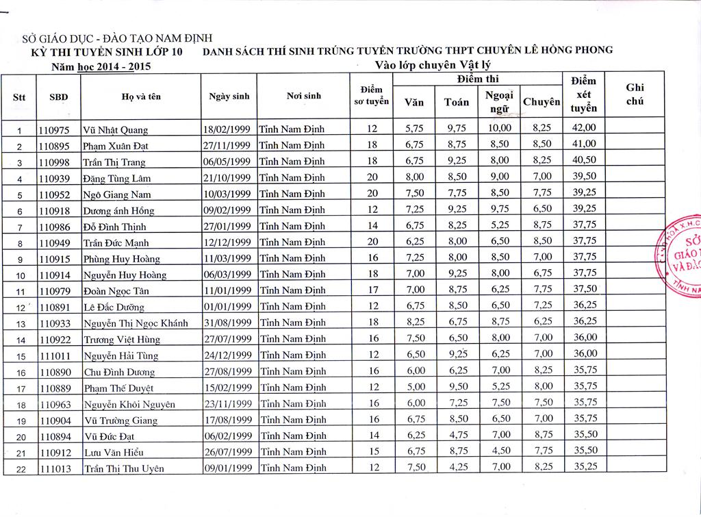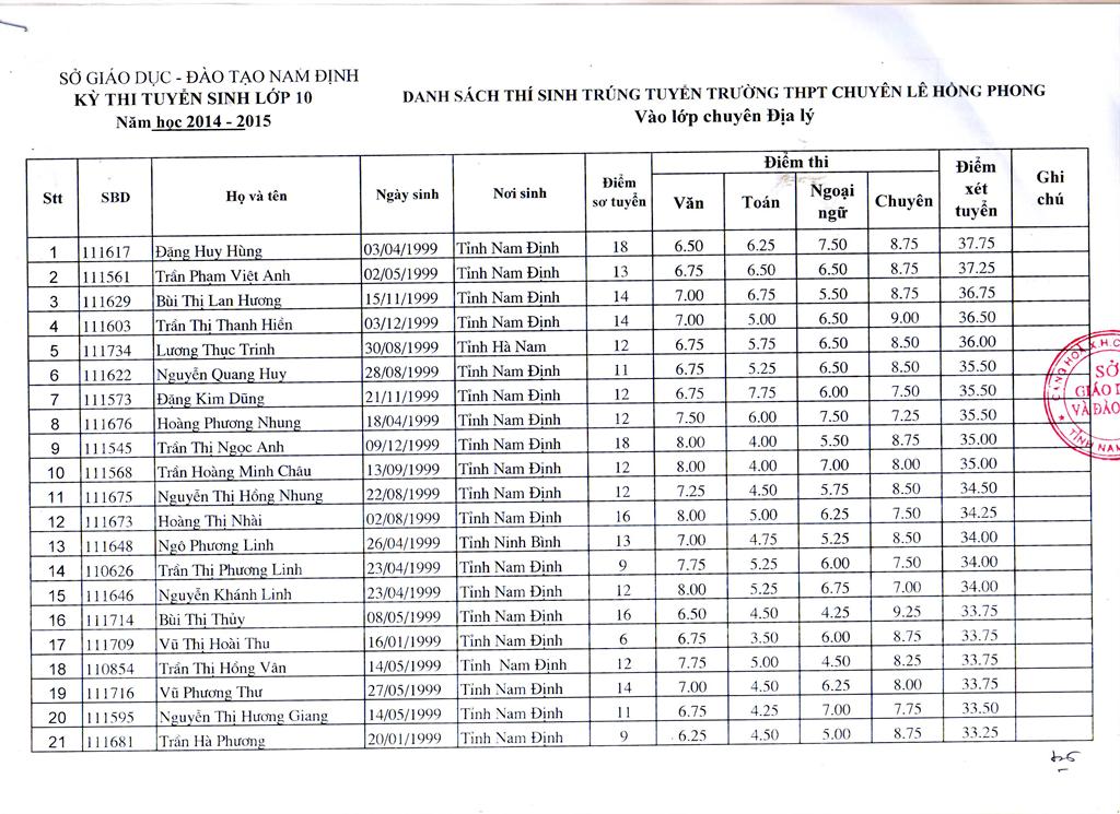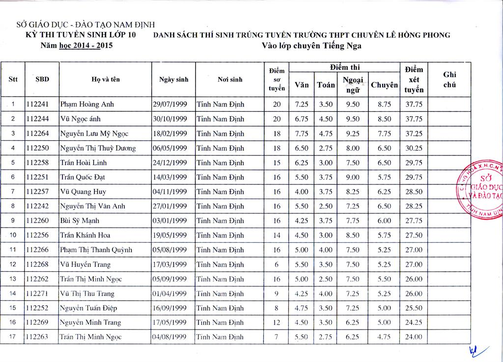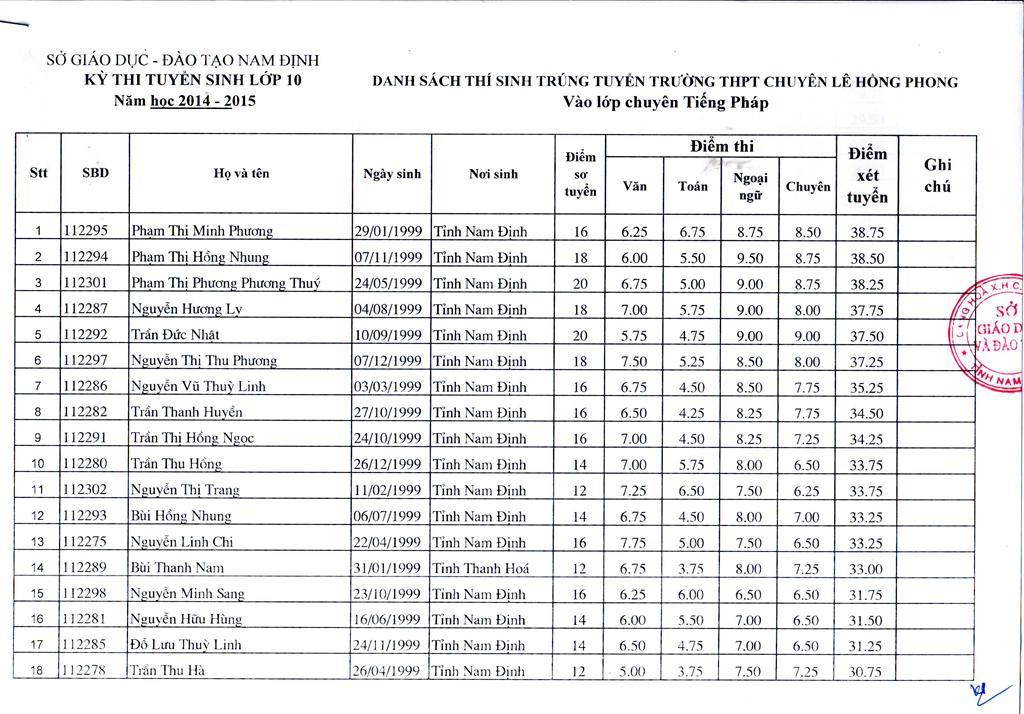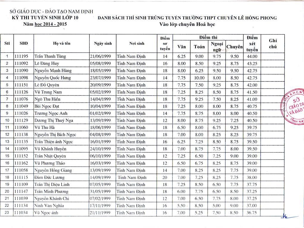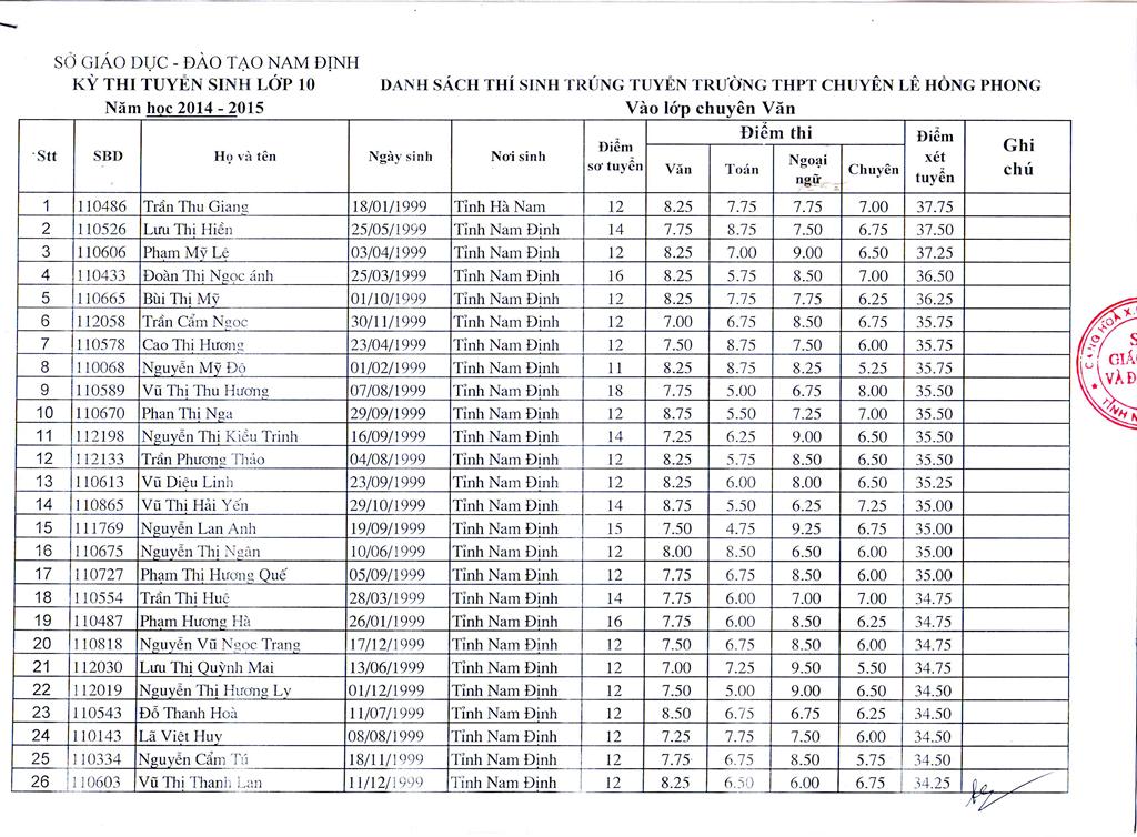 Danh sách thí sinh trúng tuyển vào lớp 10 trường THPT chuyên Lê Hồng Phong năm học 2014 - 2015