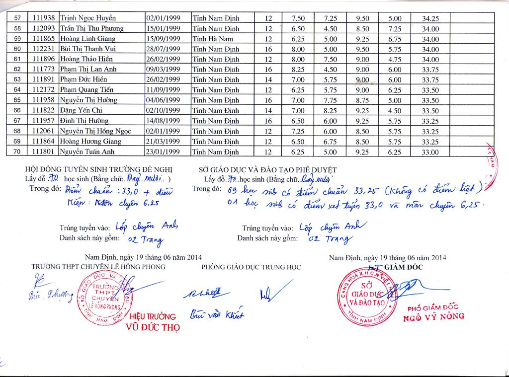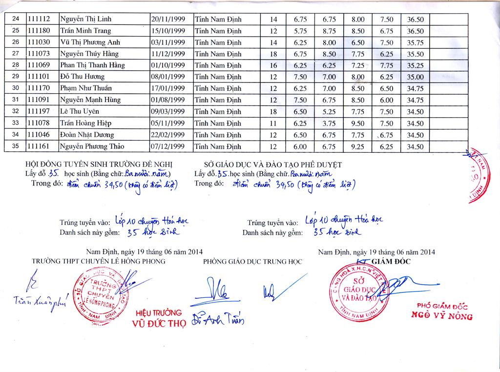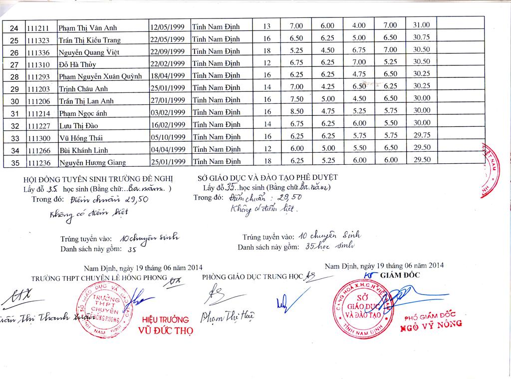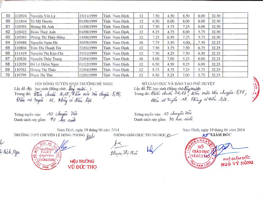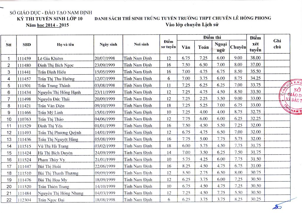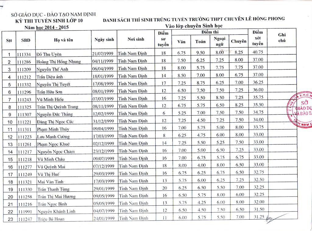Danh sách thí sinh trúng tuyển vào lớp 10 trường THPT chuyên Lê Hồng Phong năm học 2014 - 2015