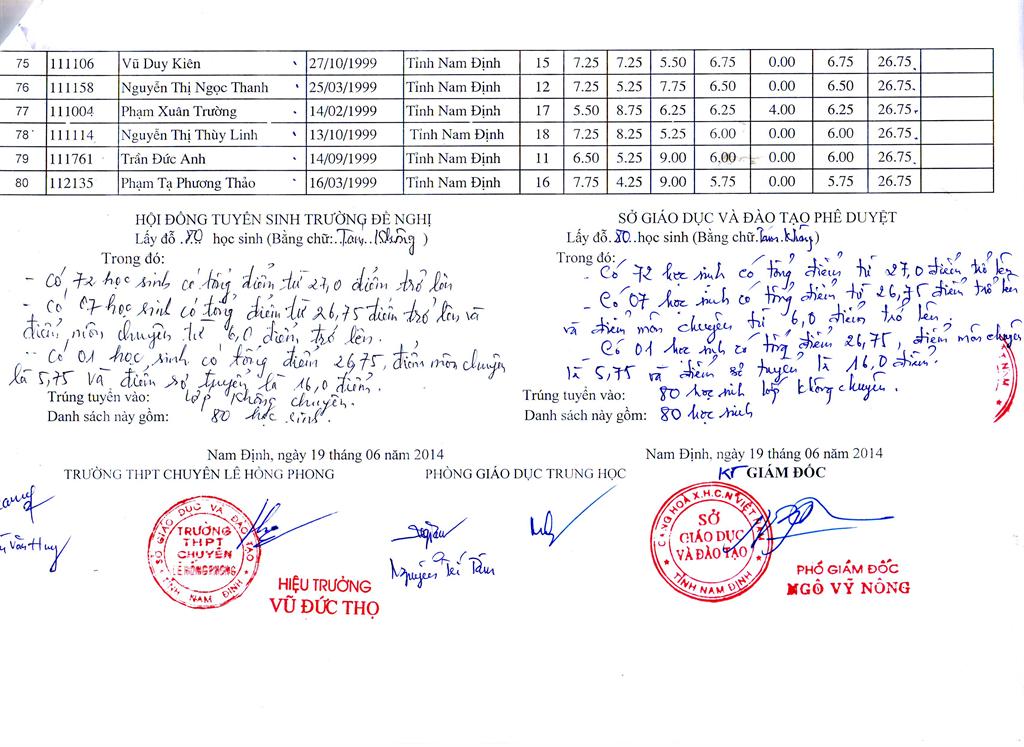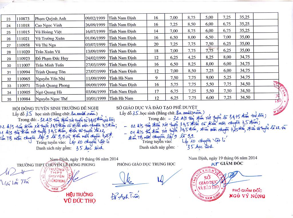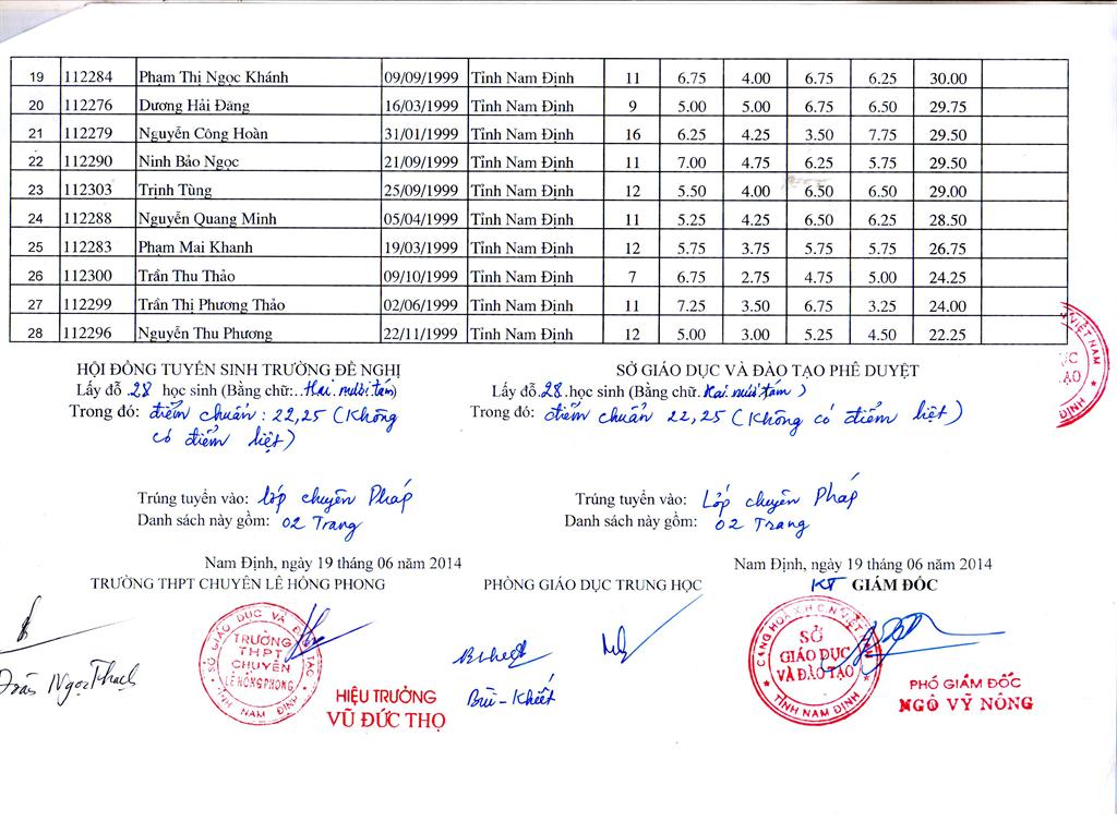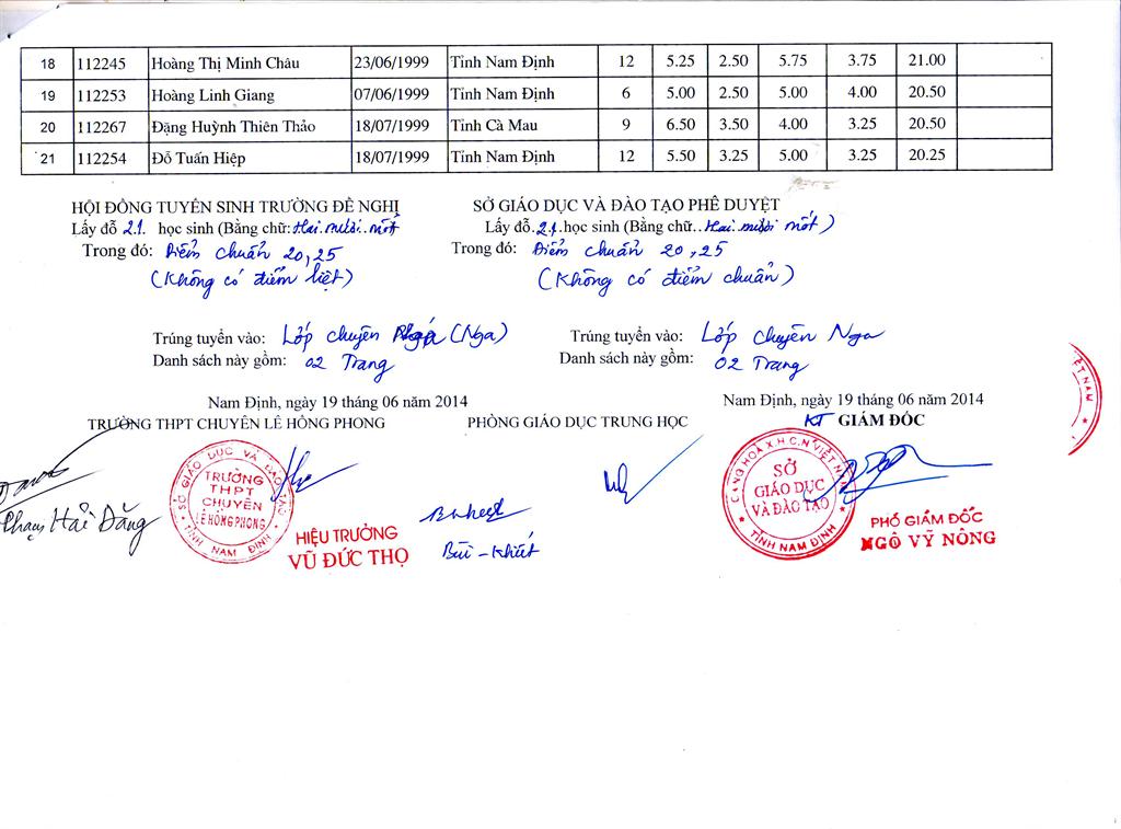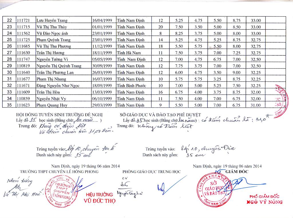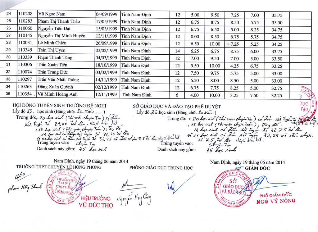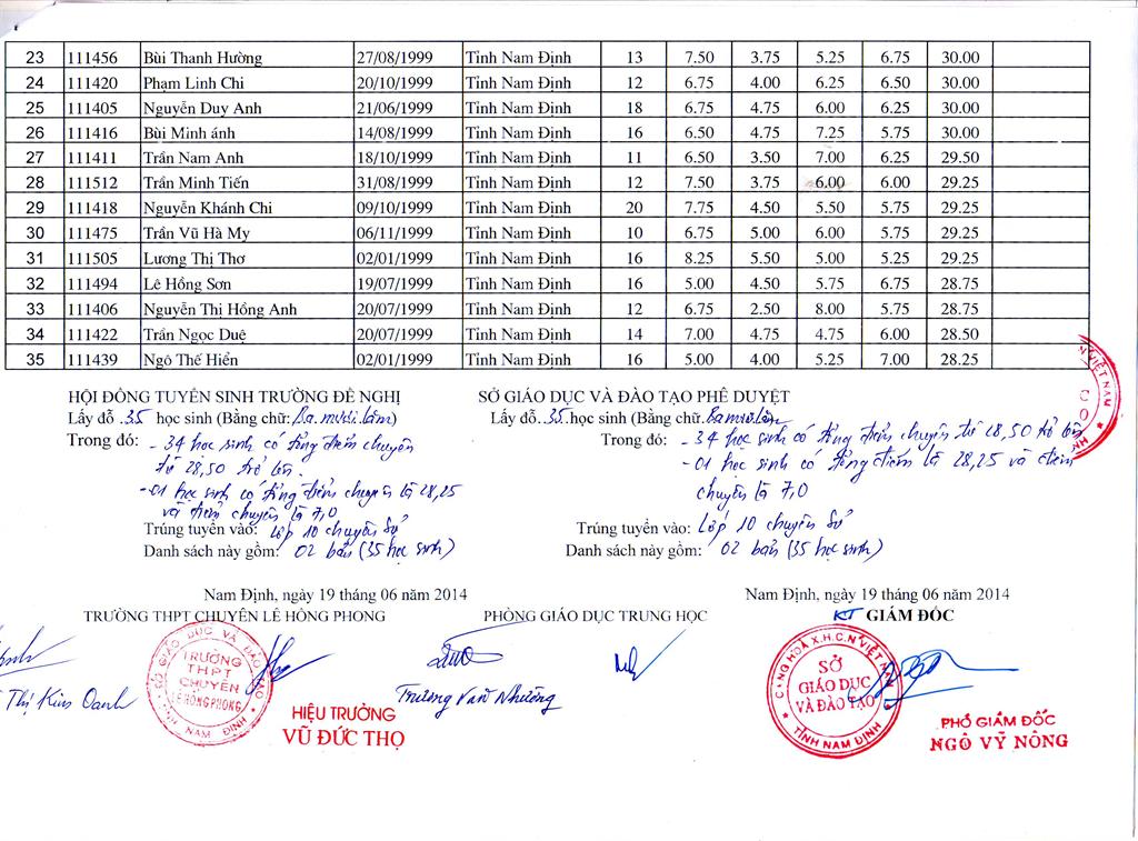 Danh sách thí sinh trúng tuyển vào lớp 10 trường THPT chuyên Lê Hồng Phong năm học 2014 - 2015
