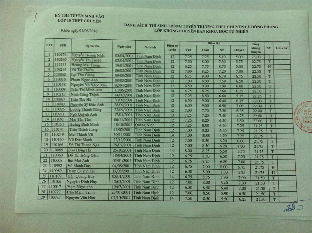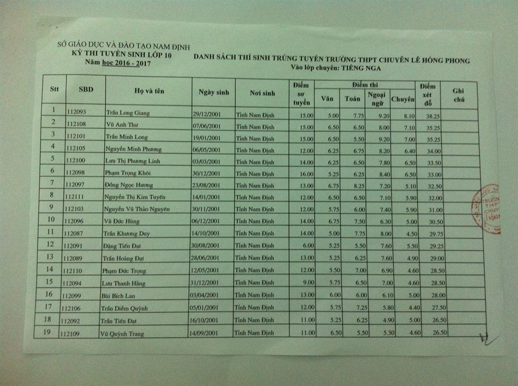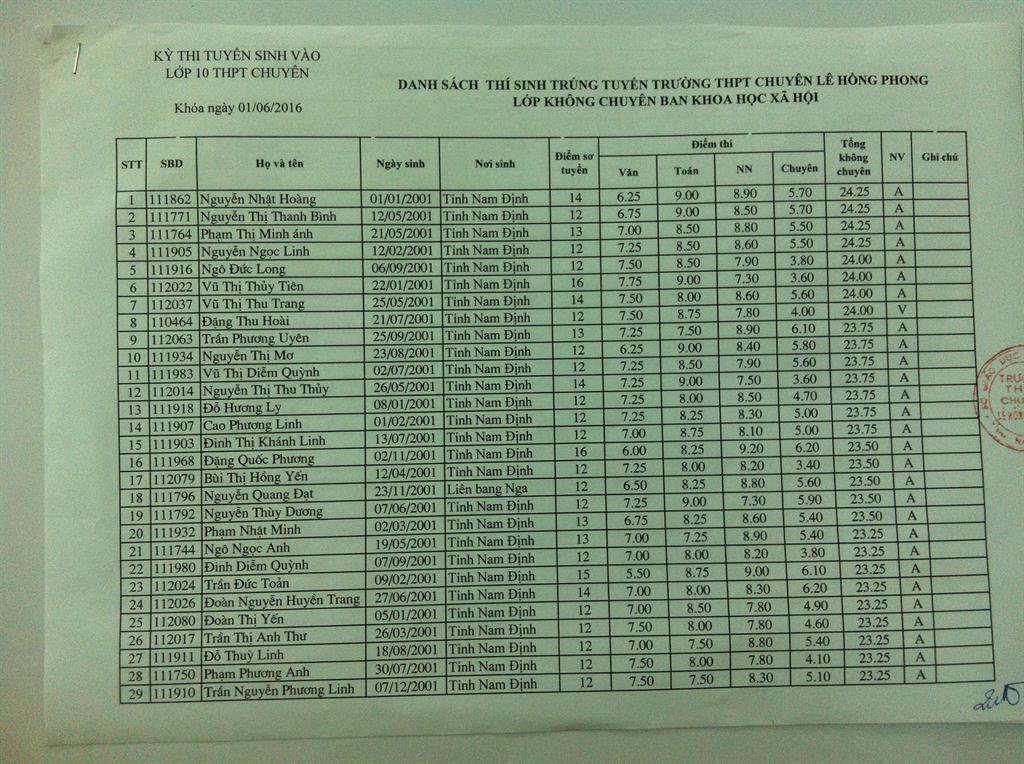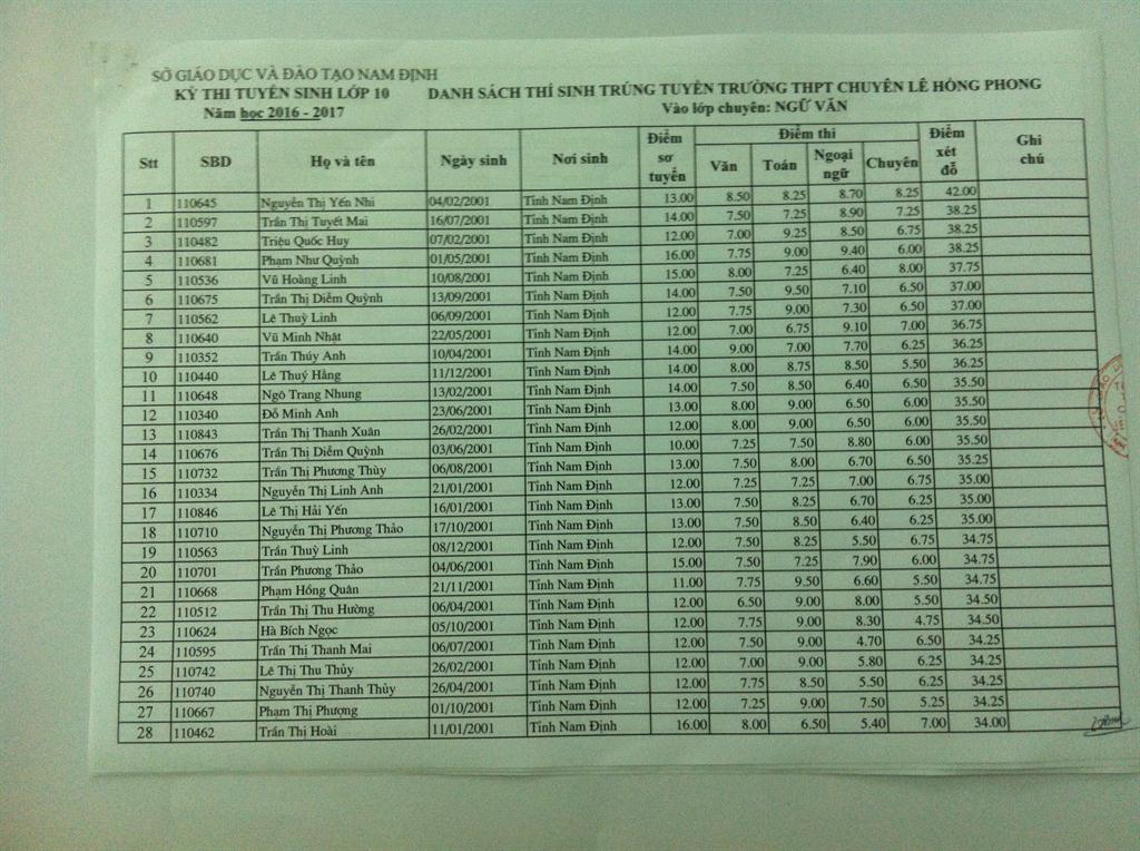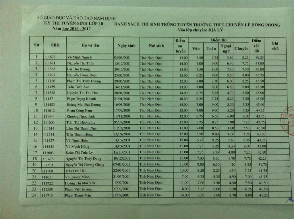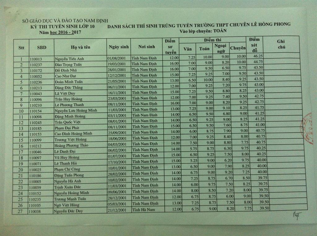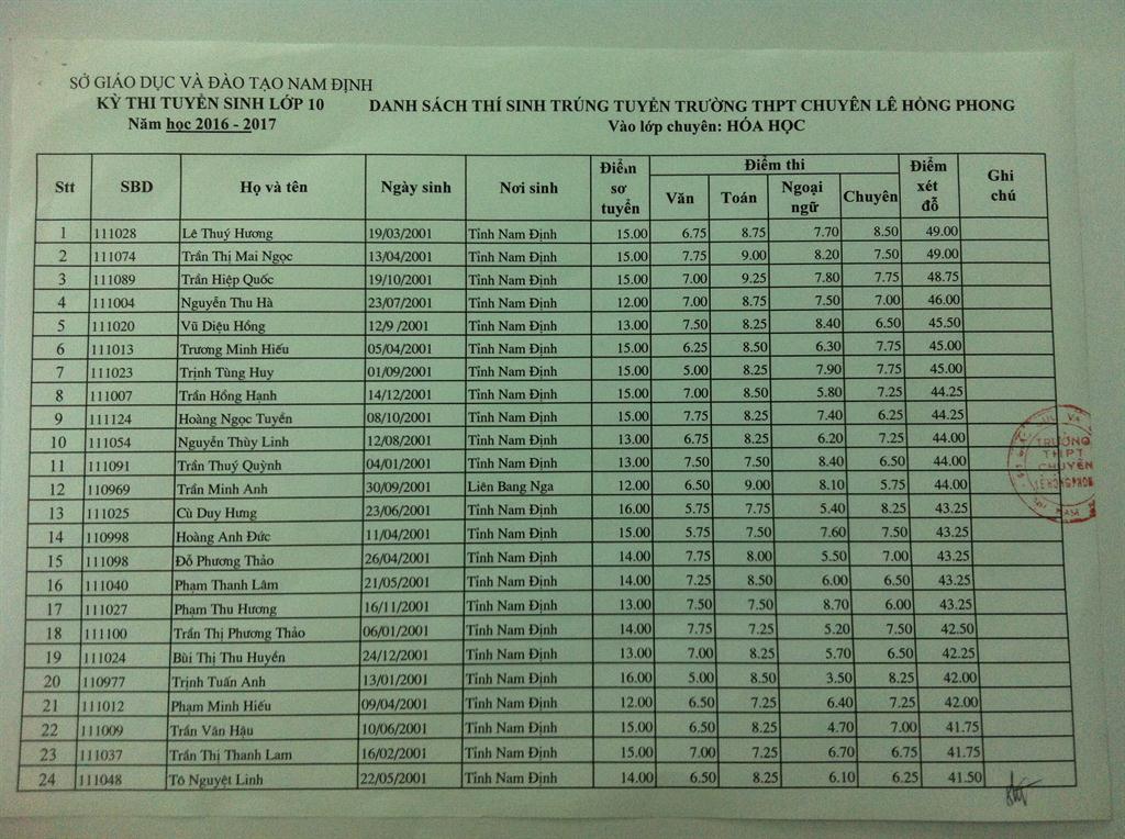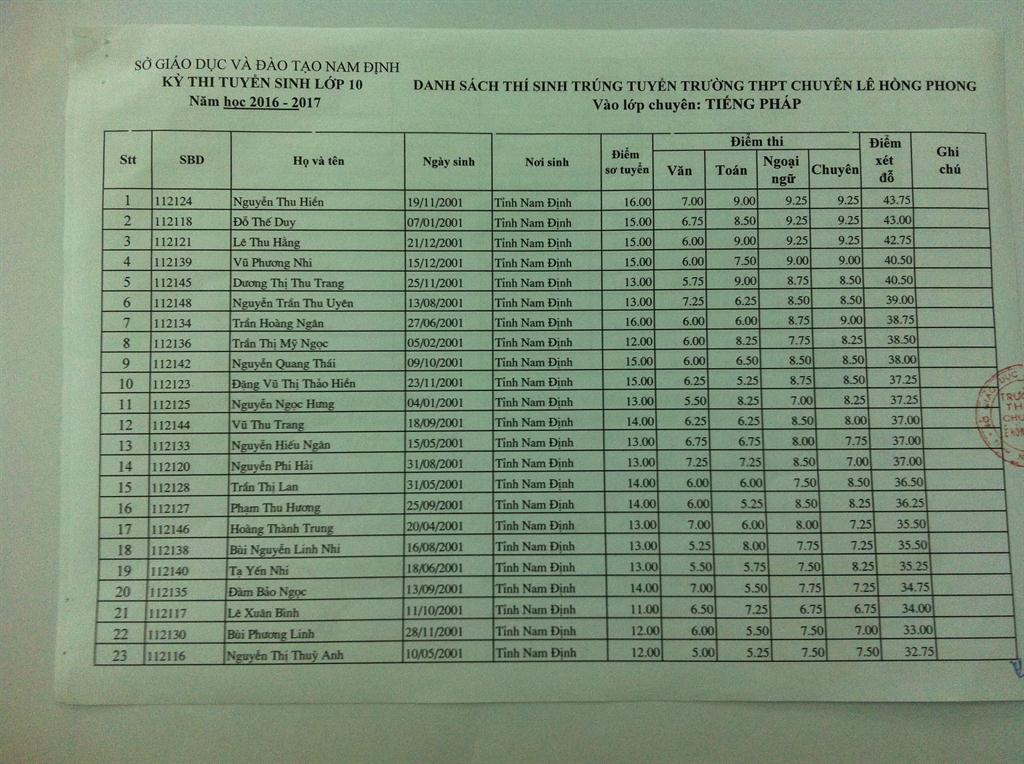 Danh sách thí sinh trúng tuyển vào trường THPT chuyên Lê Hồng Phong năm học 2016-2017