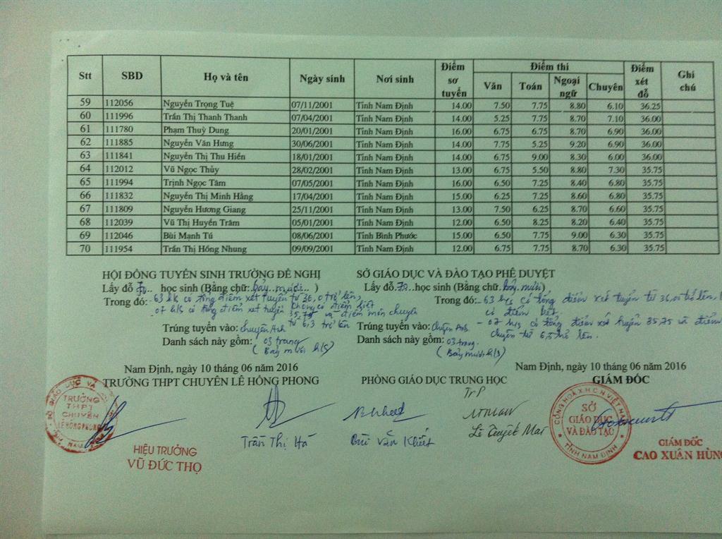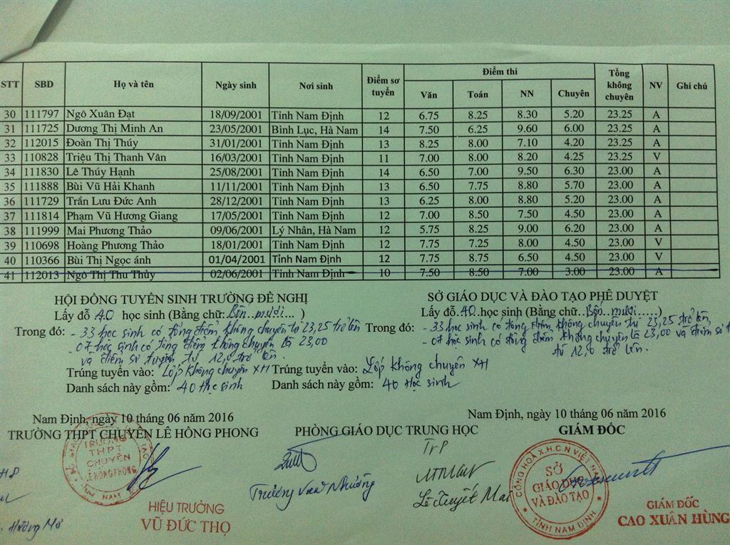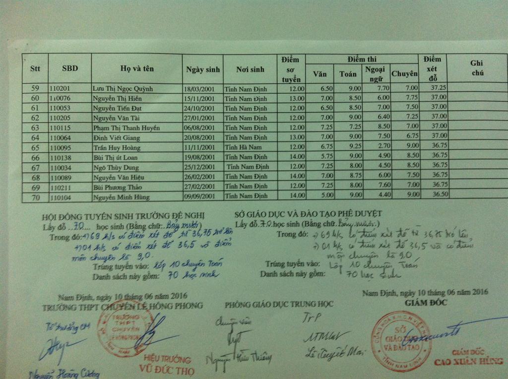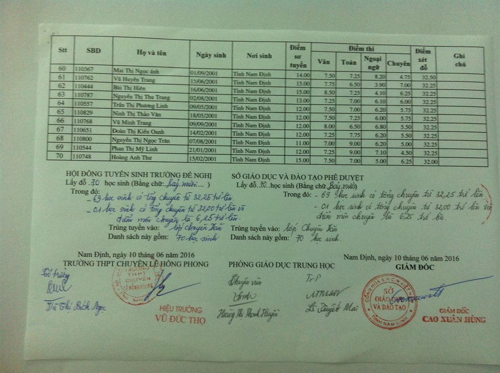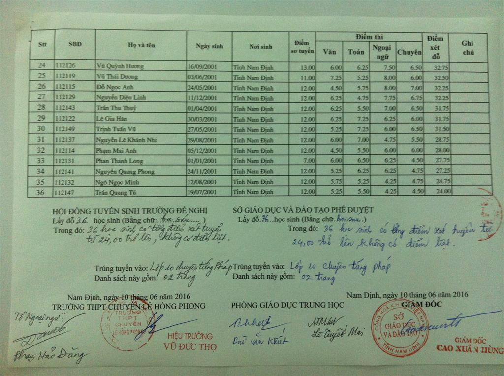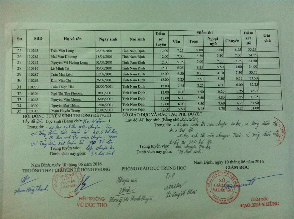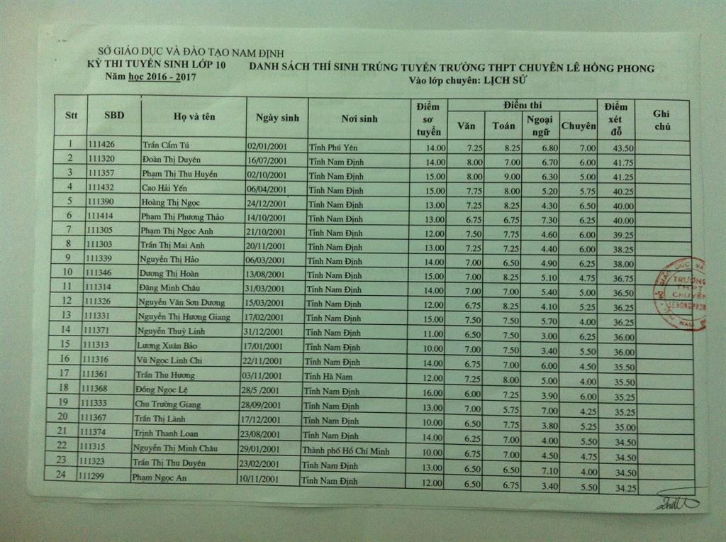 Danh sách thí sinh trúng tuyển vào trường THPT chuyên Lê Hồng Phong năm học 2016-2017