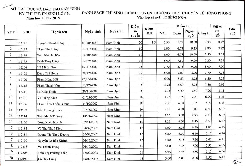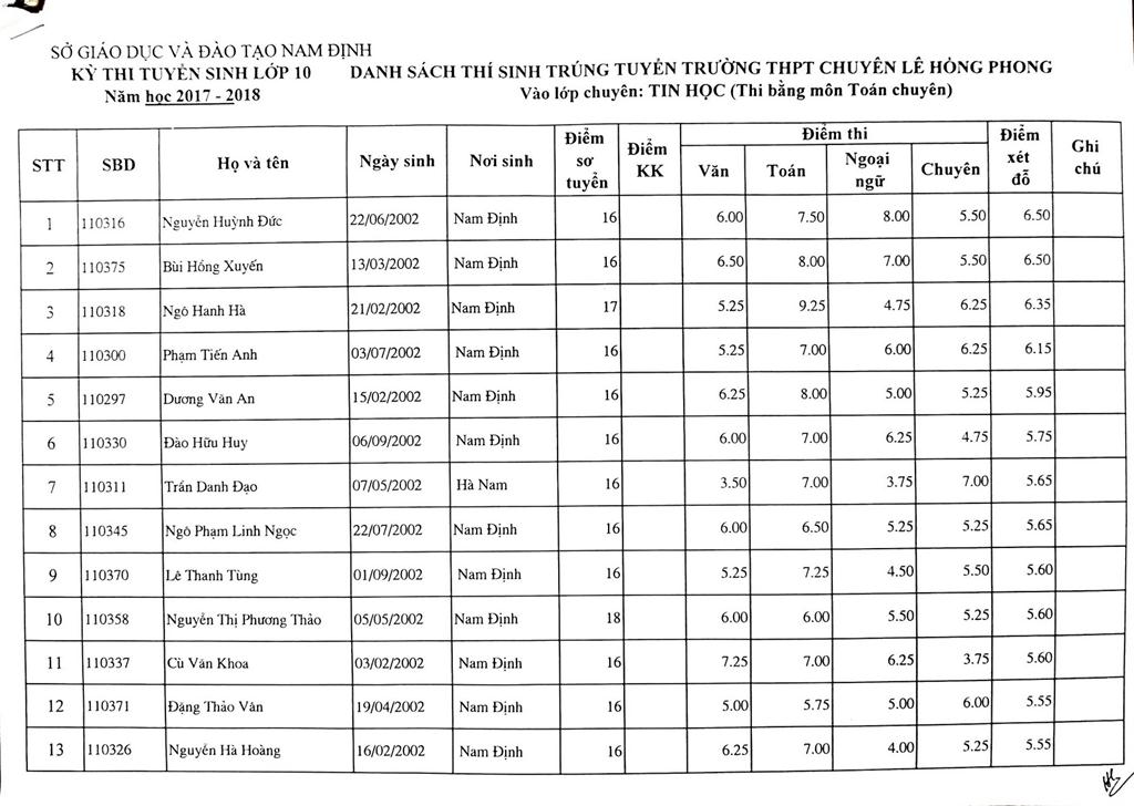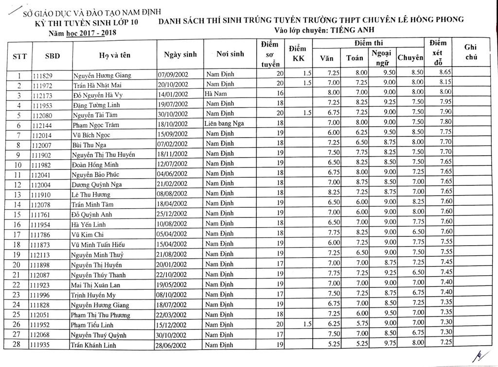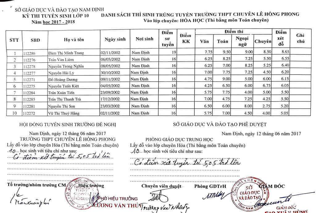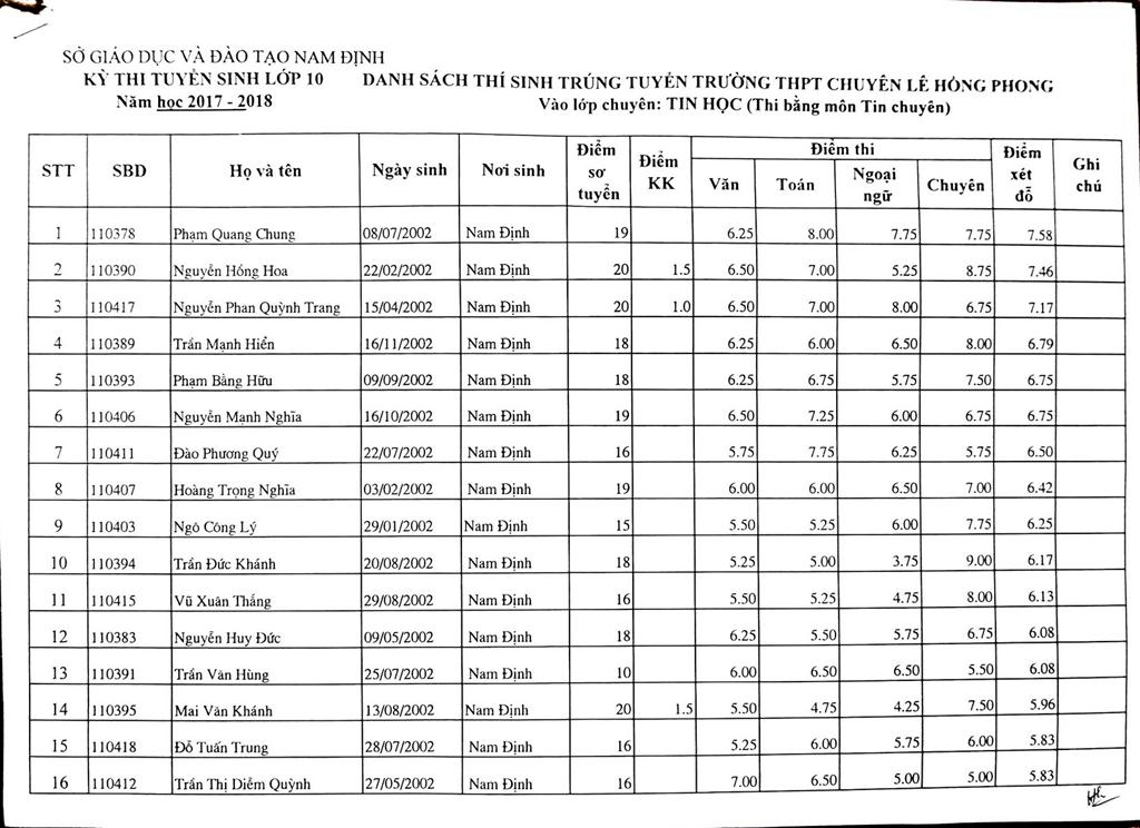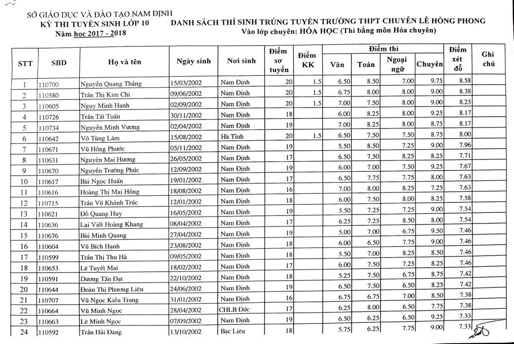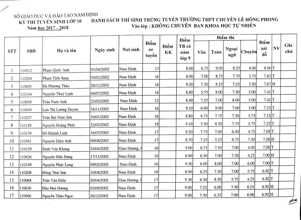 DANH SÁCH THÍ SINH TRÚNG TUYỂN VÀO TRƯỜNG THPT CHUYÊN LÊ HỒNG PHONG NĂM HỌC 2017-2018