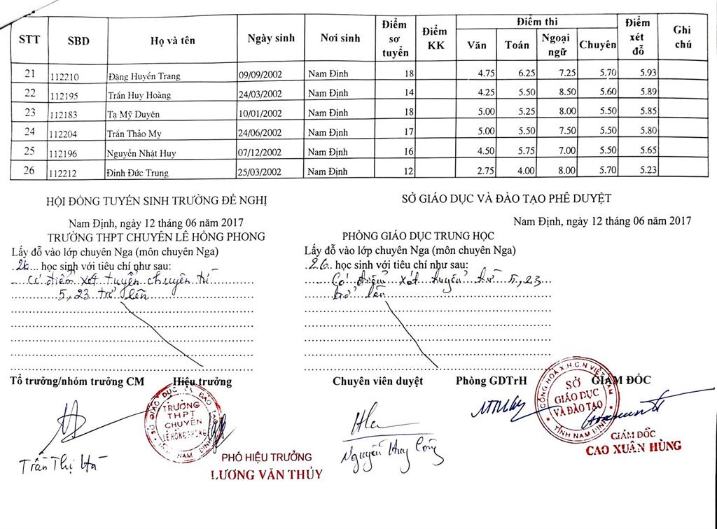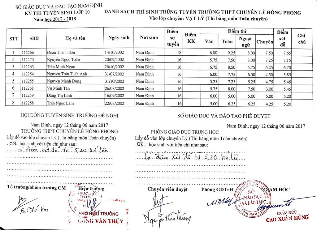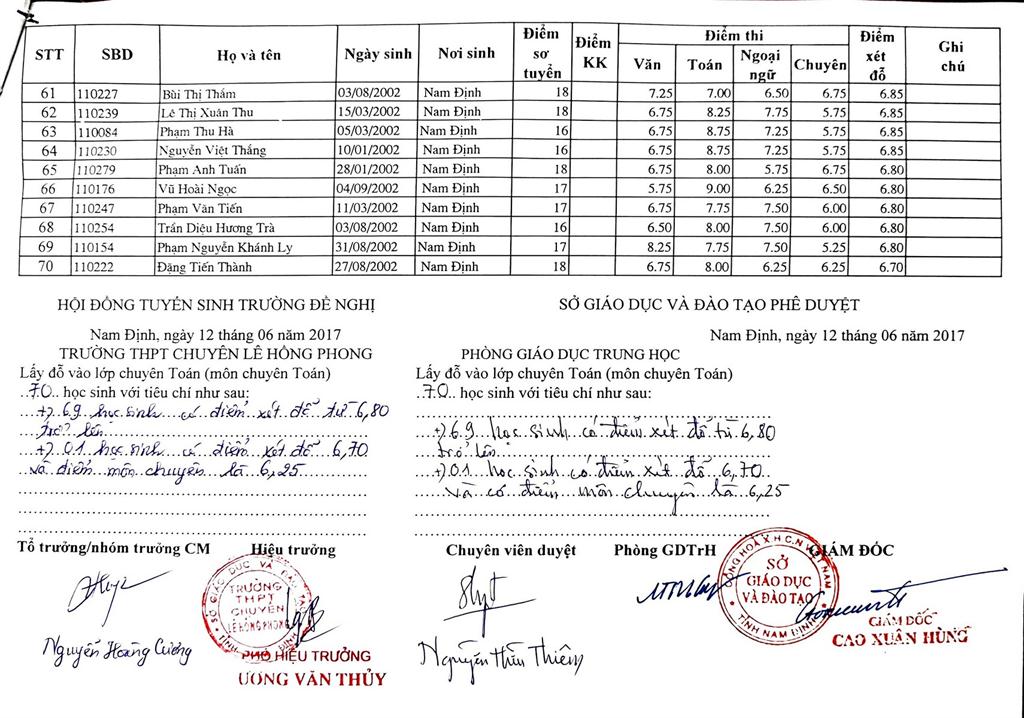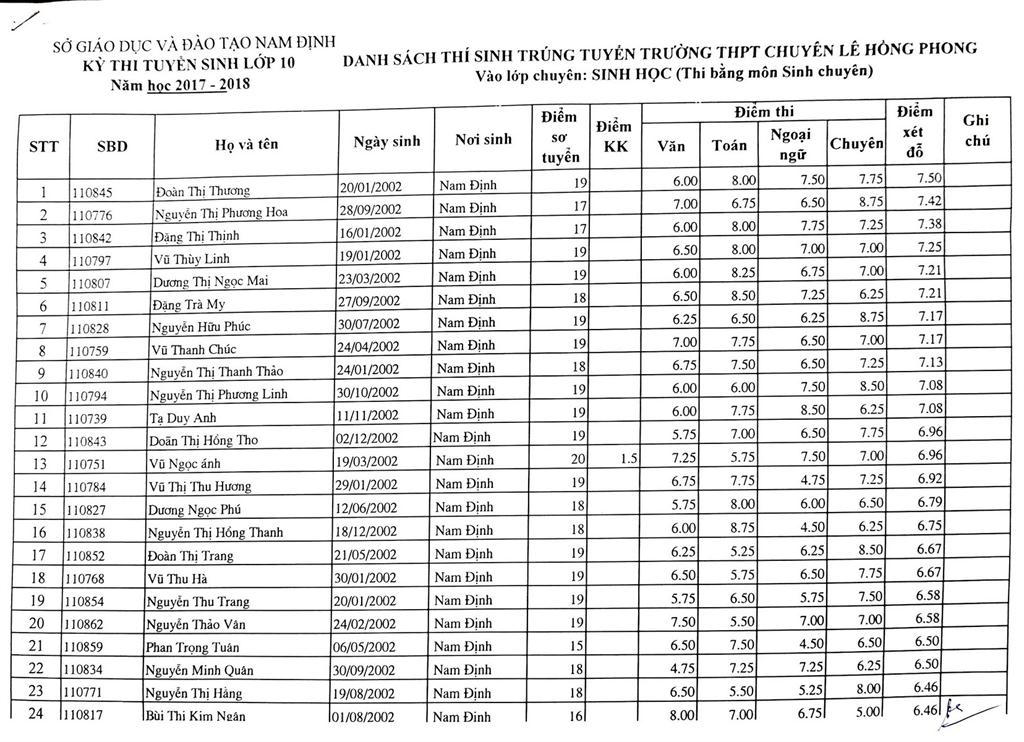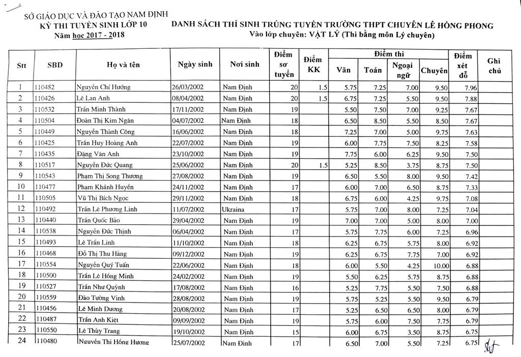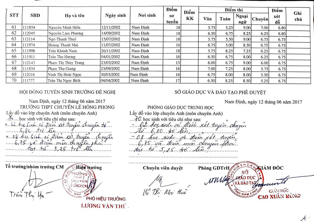DANH SÁCH THÍ SINH TRÚNG TUYỂN VÀO TRƯỜNG THPT CHUYÊN LÊ HỒNG PHONG NĂM HỌC 2017-2018