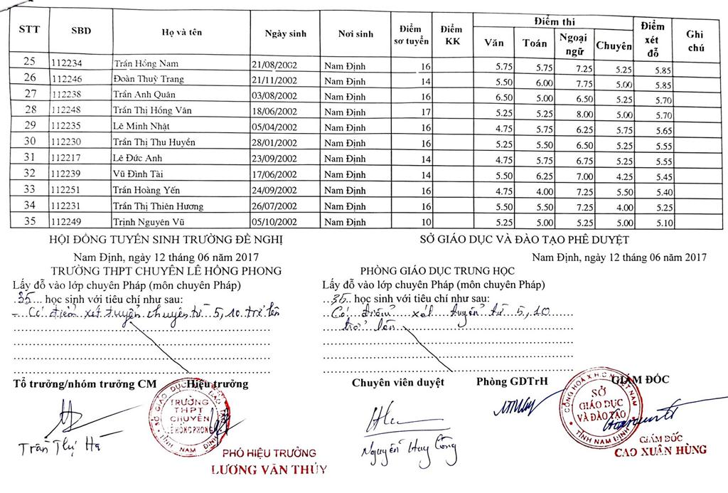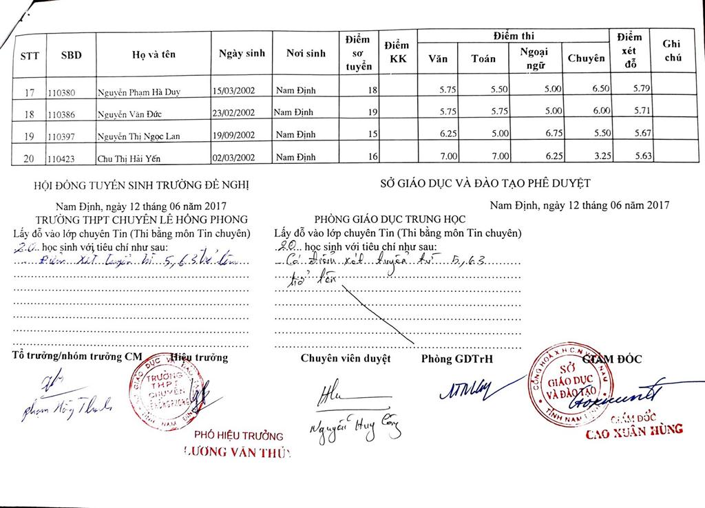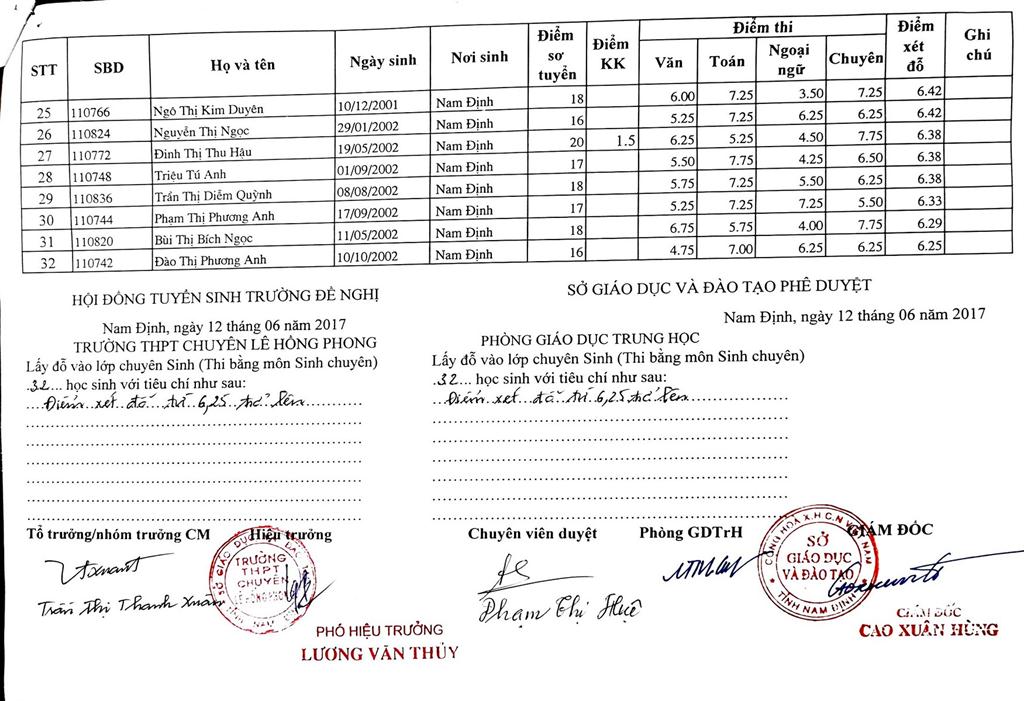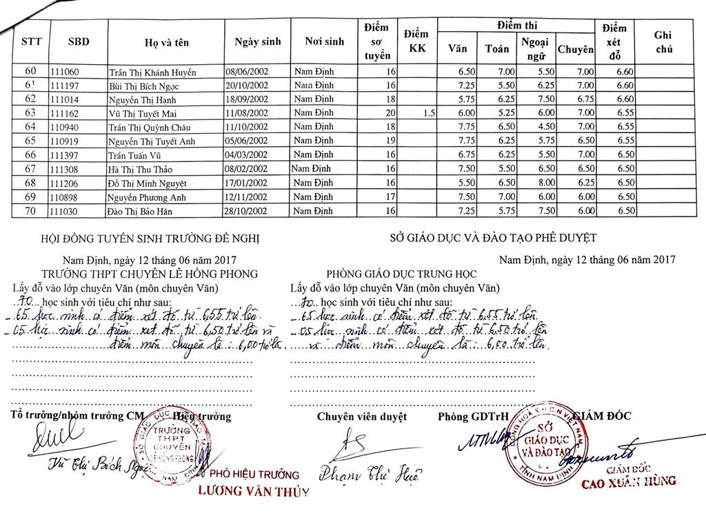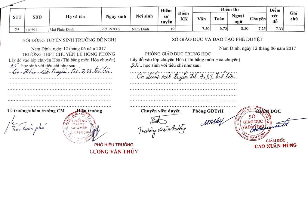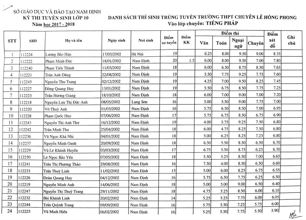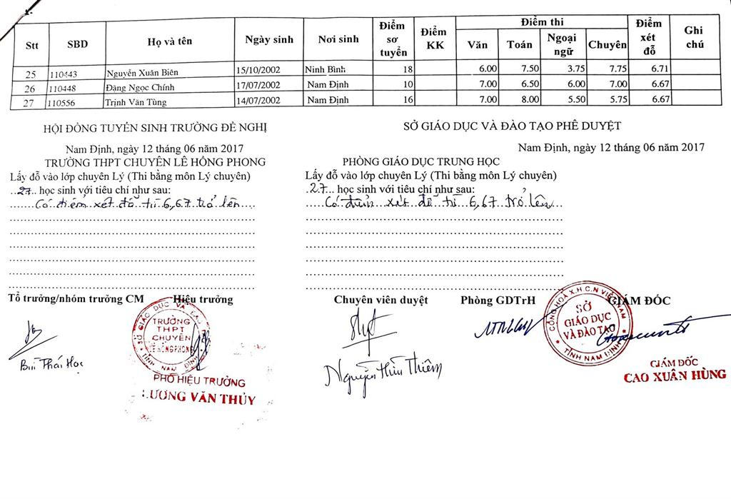 DANH SÁCH THÍ SINH TRÚNG TUYỂN VÀO TRƯỜNG THPT CHUYÊN LÊ HỒNG PHONG NĂM HỌC 2017-2018