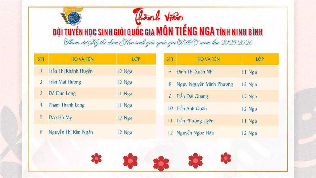 Đội tuyển Học sinh giỏi Quốc gia môn Tiếng Nga của tỉnh Ninh Bình, đến từ Trường THPT chuyên Lê Hồng Phong, là những học sinh đã lặng lẽ đi qua một hành trình dài của kỷ luật học tập và rèn luyện trí tuệ. Mỗi ngày ôn luyện là một ngày các em chinh phục cấu trúc ngôn ngữ phức tạp, đào sâu khả năng tư duy logic, mở rộng hiểu biết về văn hóa và chiều sâu tinh thần Nga – nền tảng quan trọng để bước vào sân chơi học thuật đỉnh cao.