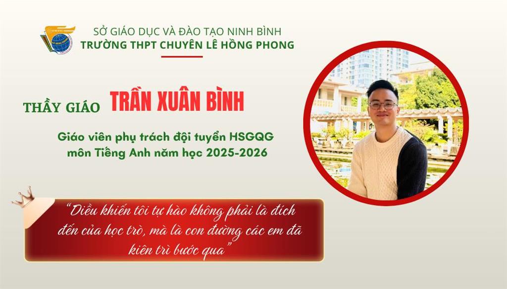 Năm học 2025–2026 đánh dấu lần thứ ba thầy Trần Xuân Bình đảm nhiệm vai trò lãnh đội tuyển học sinh giỏi quốc gia môn Tiếng Anh. Với thầy, đây là công việc “vất vả, áp lực, cần rất nhiều sức lực và trí lực” – nhưng cũng là một vinh dự lớn lao. Đằng sau mỗi buổi học kéo dài, những buổi soạn bài đến khuya, với thầy Bình, đó là mong muốn duy nhất, “giúp học trò đi xa nhất có thể”. những nỗ lực được đền đáp bằng kết quả đầy tự hào: 02 giải Nhất, 09 giải Nhì, 03 giải Ba và 02 giải Khuyến khích trong Kỳ thi chọn HSGQG năm học 2025–2026, đặc biệt học sinh Đoàn Thái Minh đạt giải Nhất quốc gia ở vị trí Thủ khoa toàn quốc.
