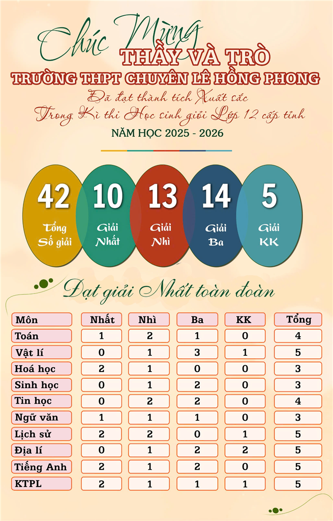 Kết quả ấy không chỉ là điểm nhấn của một mùa thi, mà còn là lời khẳng định mạnh mẽ về hướng đi đúng đắn trong công tác phát hiện, bồi dưỡng học sinh giỏi, về sự đồng lòng của tập thể sư phạm và ý chí chinh phục đỉnh cao của các thế hệ học sinh. Từ những thành tích hôm nay, thầy trò Trường THPT chuyên Lê Hồng Phong có thêm động lực để tiếp tục viết tiếp những trang rực rỡ hơn nữa trên hành trình tri thức, sẵn sàng hướng tới những mục tiêu cao hơn trong các kỳ thi học sinh giỏi cấp quốc gia và quốc tế...