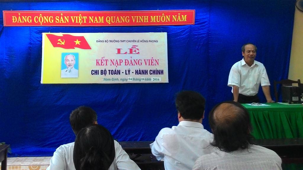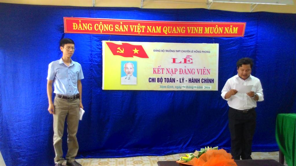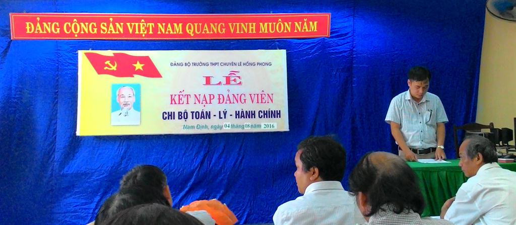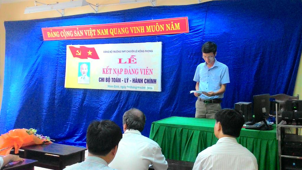 09/08/2016Tại trường THPT chuyên Lê Hồng Phong - Nam Định, ngoài công tác chuyên môn – nghiệp vụ, công tác Đảng – đặc biết công tác phát triển Đảng cũng được nhà trường quan tâm sát sao. Vào ngày 4/8/2016, chi bộ Toán – Lí- Hành chính thuộc Đảng bộ trường THPT chuyên Lê Hồng Phong đã tổ chức lễ kết nạp Đảng viên mới cho quần chúng Trần Mạnh Sang.