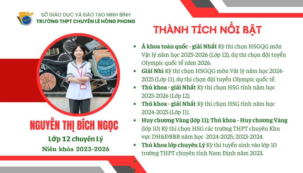 Trong bảng vàng thành tích của Trường THPT chuyên Lê Hồng Phong, cái tên Nguyễn Thị Bích Ngọc, học sinh lớp 12 chuyên Vật lý hiện lên rực sáng với giải Nhất – vị trí Á khoa Kỳ thi chọn học sinh giỏi quốc gia năm học 2025–2026. Một thành tích xứng đáng cho hành trình học tập bền bỉ, nơi mỗi kiến thức đều được Ngọc đi đến tận cùng, mỗi bài toán khó đều được em kiên nhẫn “giải mã” bằng sự tỉ mỉ và quyết tâm hiếm thấy.