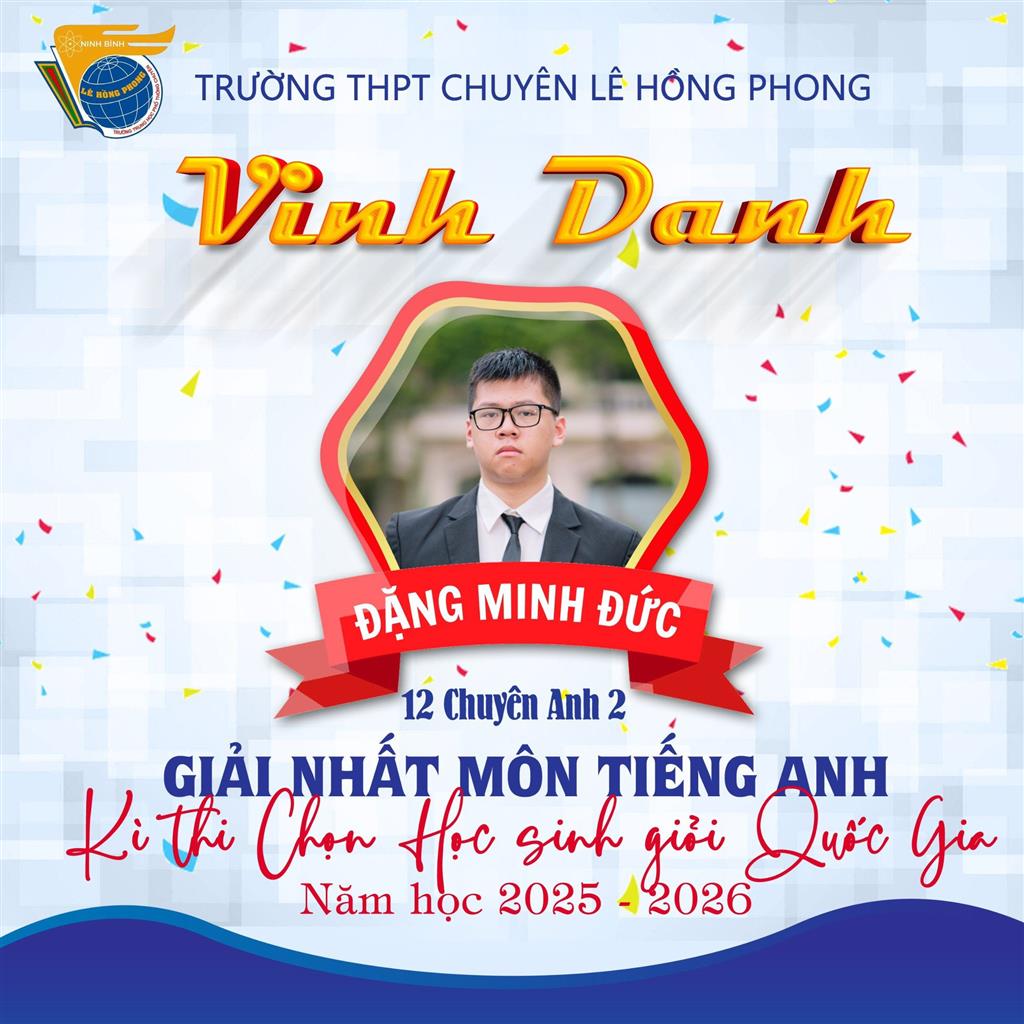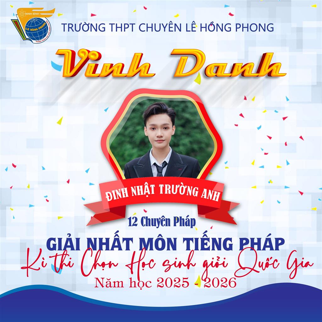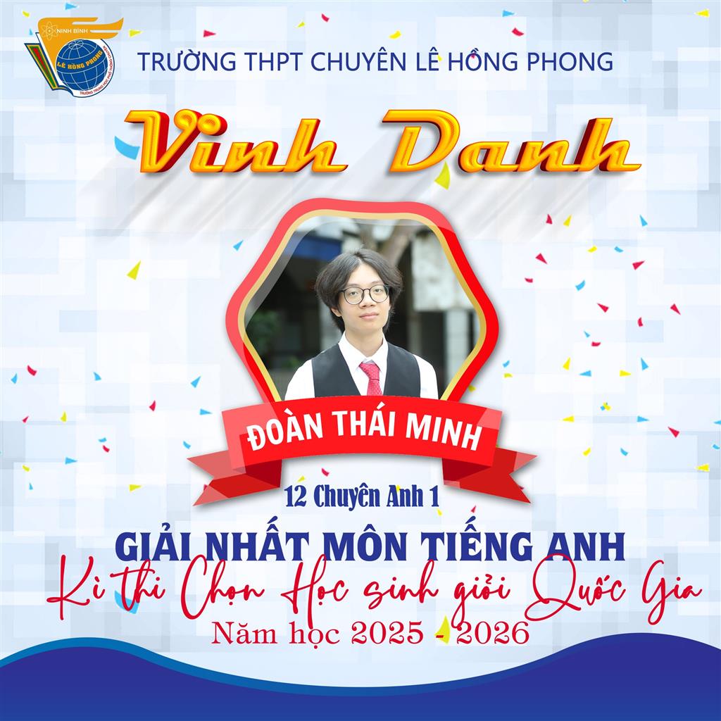 141 gương mặt tinh hoa nhất của đất học quê hương đã tham gia 11 đội tuyển Học sinh giỏi Quốc gia tỉnh Ninh Bình đều là những người chiến thắng trên hành trình trí tuệ của chính mình. Dù là Giải Nhất, Giải Nhì, Giải Ba hay Khuyến khích, mỗi em đều đã hoàn thành xuất sắc chặng đường đã chọn, ghi tên mình vào bảng vàng truyền thống và góp phần làm nên mùa vàng thành tích của ngôi nhà chung Lê Hồng Phong. Trong niềm tự hào chung ấy, xin được vinh danh 6 chiến binh đã chạm tới đỉnh cao Giải Nhất Quốc gia.
