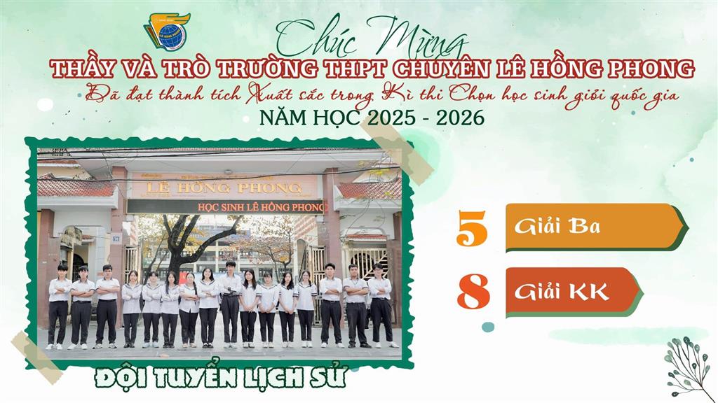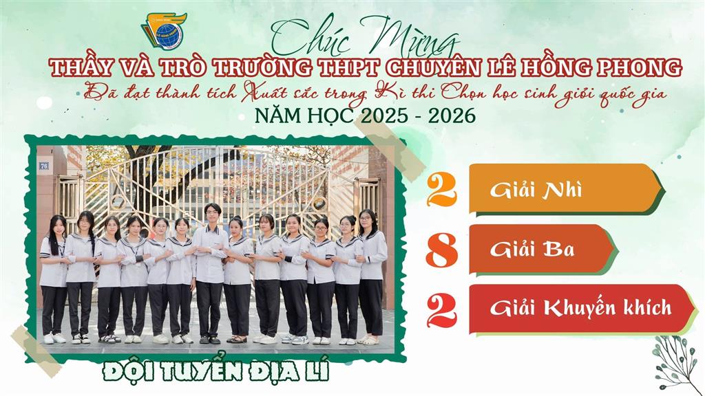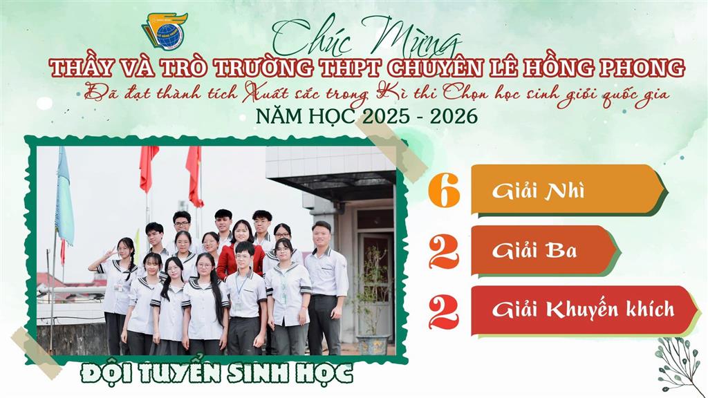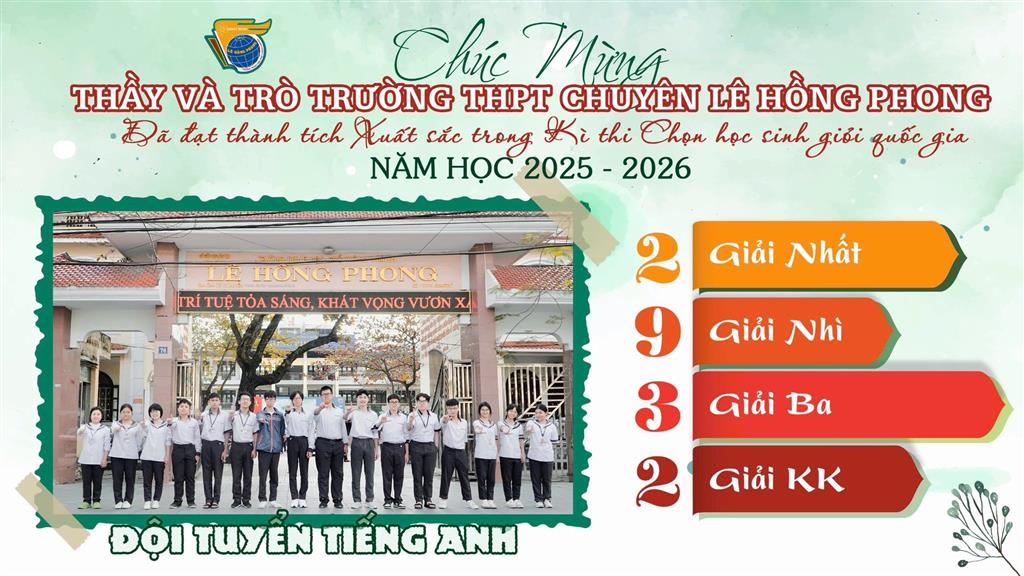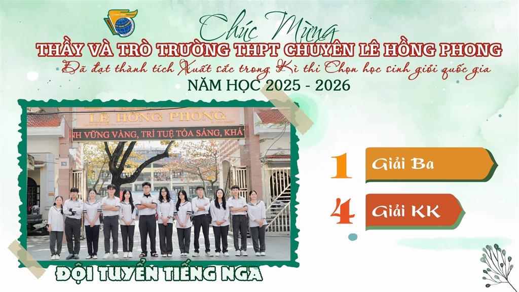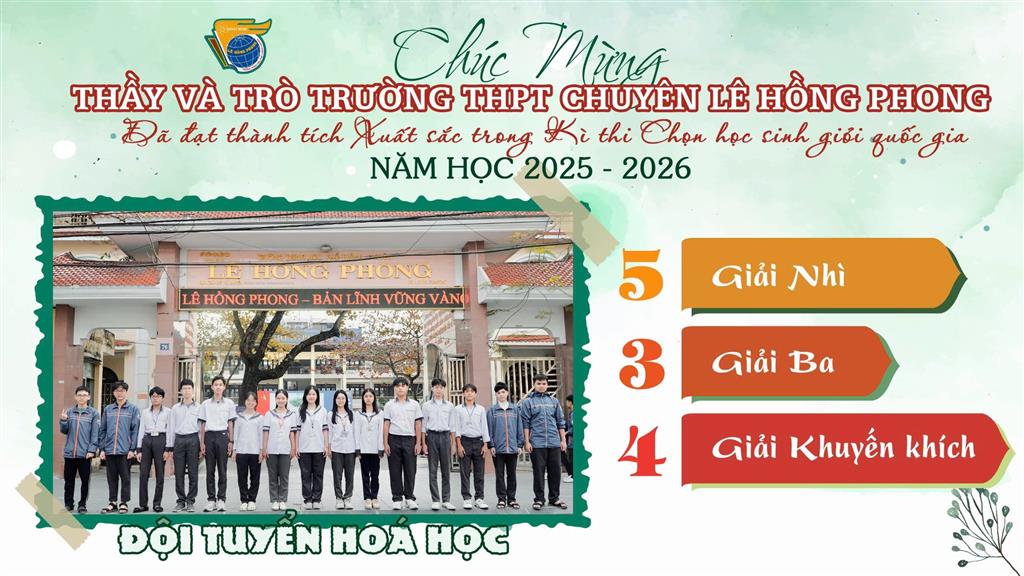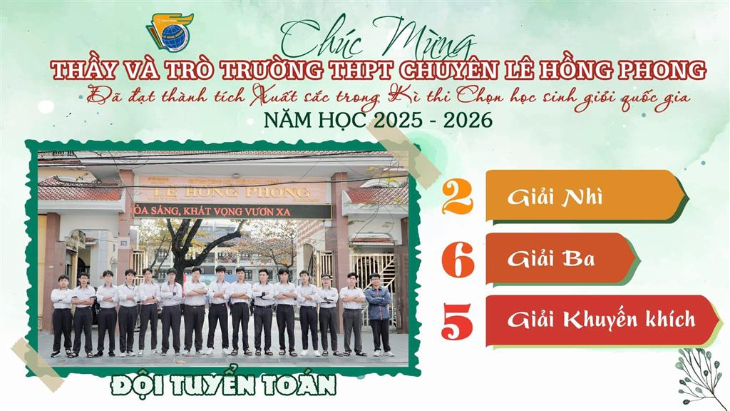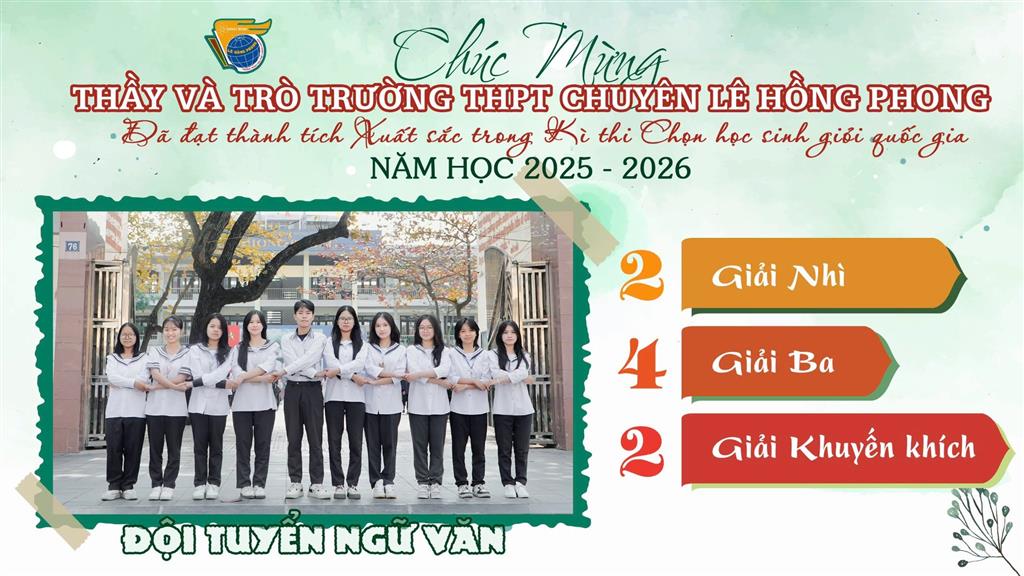 Xin gửi lời chúc tốt đẹp tới các thành viên đội tuyển Học sinh giỏi quốc gia, các em đã và đang làm nên mùa vàng thành tích, đồng thời gieo những hạt mầm niềm tin cho các thế hệ học sinh trường THPT chuyên Lê Hồng Phong. Chúc các em tiếp bước, tự tin chinh phục những đỉnh cao mới…