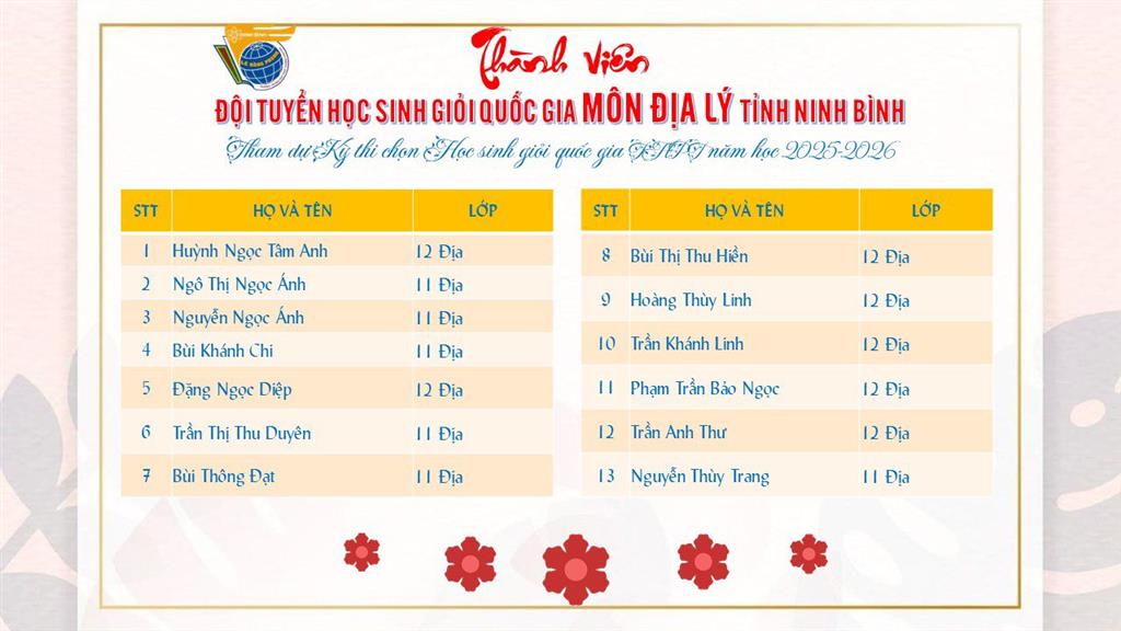 Ngày 25,26/12/2025; đội tuyển HSGQG môn Địa lý sẽ căng buồm vững gió, tự tin vượt sóng, để hành trình của các em góp phần làm rạng danh mái trường và vùng đất hiếu học thân yêu. Chúng ta cùng gửi lời chúc tốt đẹp nhất và niềm tin chiến thắng tới 13 thành viên ưu tú của đội tuyển HSGQG Địa lý!