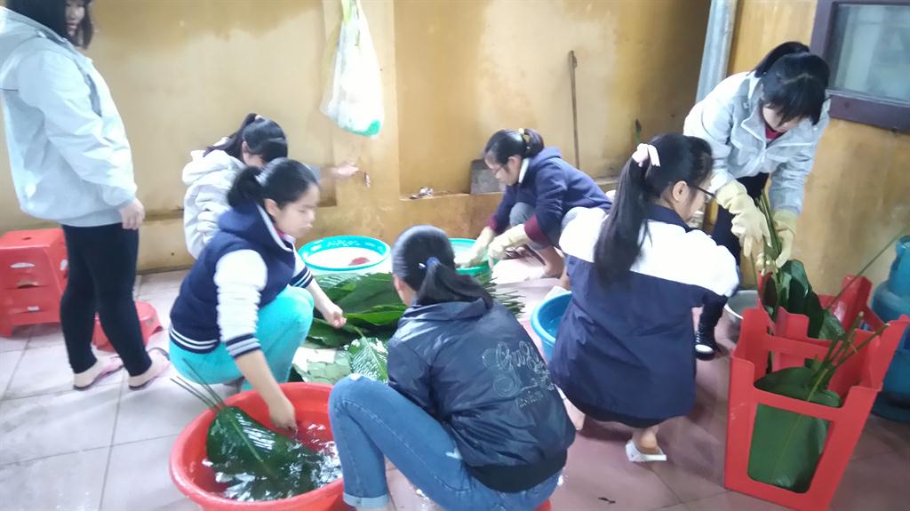 Hơn một tuần qua không khí trong khu nội trú như nhộn nhịp hẳn lên, ai ai cũng háo hức mong chờ đến ngày được gói chiếc bánh chưng đầu tiên. Các em còn tích cực tham gia giúp các bác nhà bếp rửa lá, vo gạo, đãi đỗ, nhặt hành chuẩn bị nguyên liệu để gói bánh.