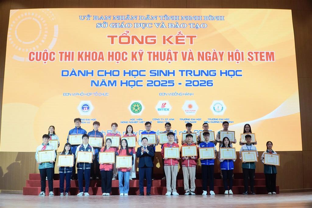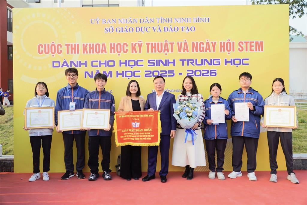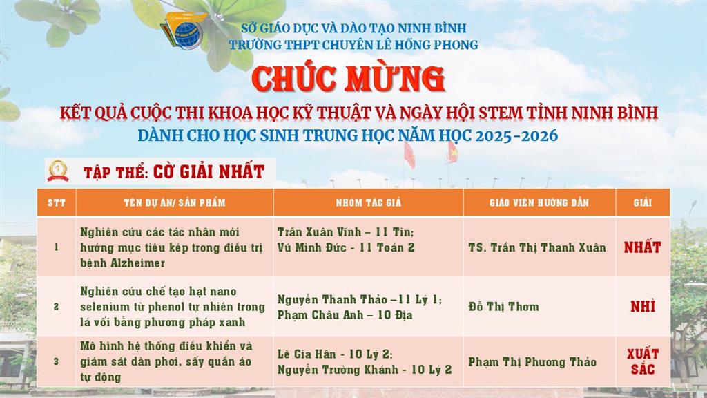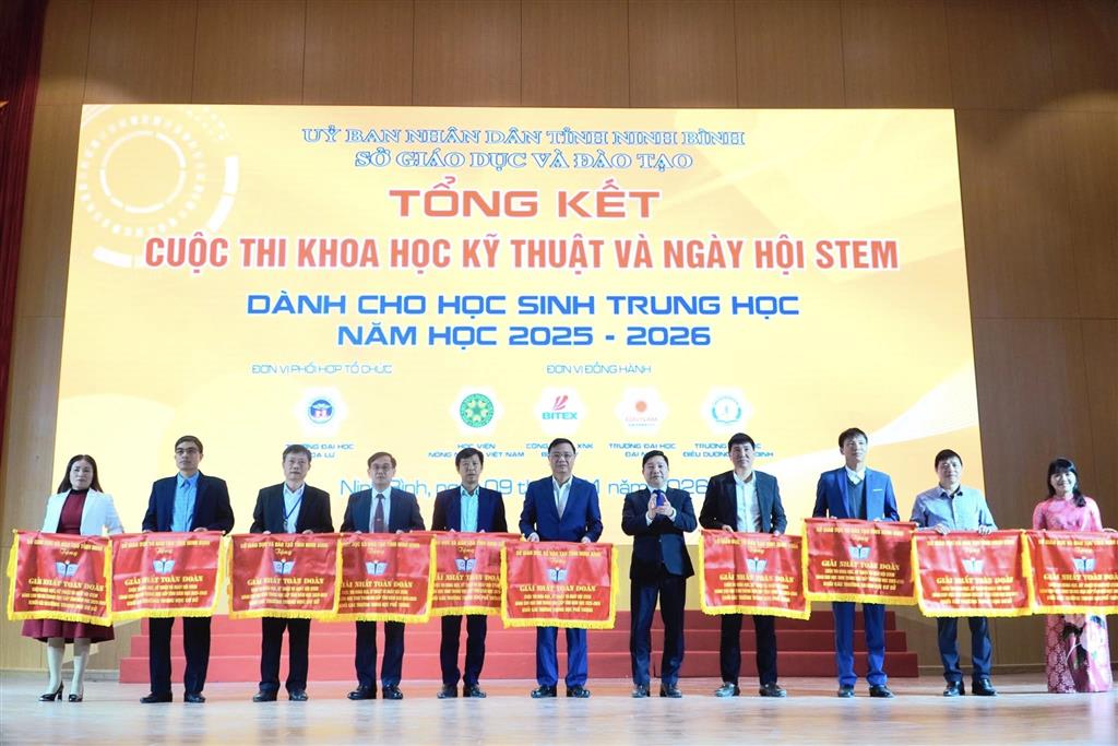 22/01/2026Tại Cuộc thi Khoa học kỹ thuật và Ngày hội STEM cấp tỉnh năm học 2025–2026 do Sở Giáo dục và Đào tạo Ninh Bình tổ chức, Trường THPT Chuyên Lê Hồng Phong đã xuất sắc xếp thứ Nhất toàn tỉnh, vinh dự đón nhận Cờ Giải Nhất toàn đoàn, khẳng định mạnh mẽ vị thế ngọn cờ đầu trong phong trào nghiên cứu khoa học và giáo dục STEM bậc THPT.