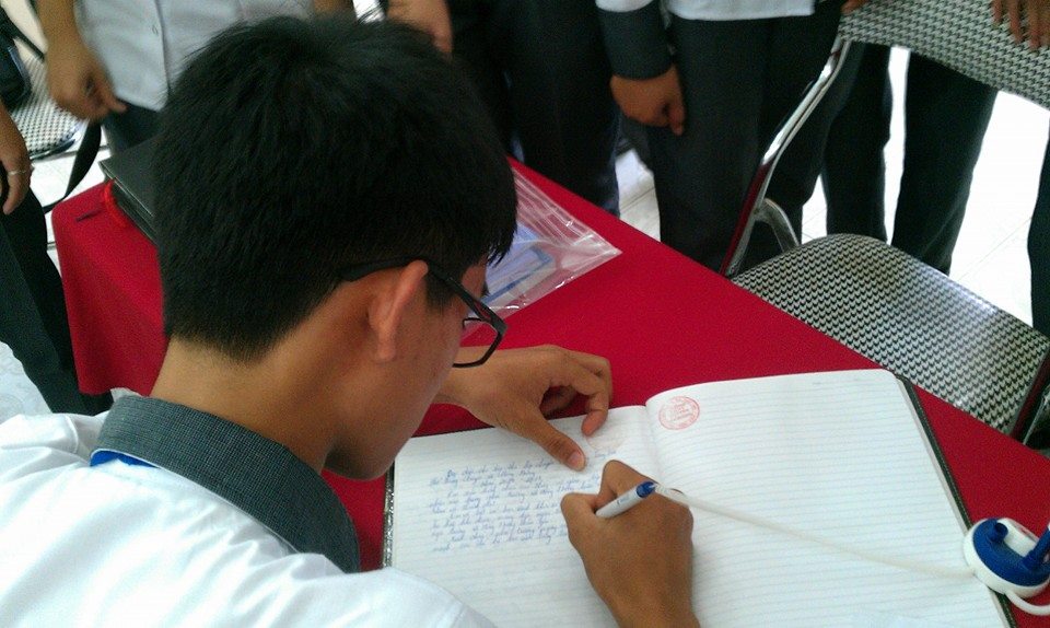 Học sinh viết sổ lưu niệm khi tới thăm phòng truyền thống